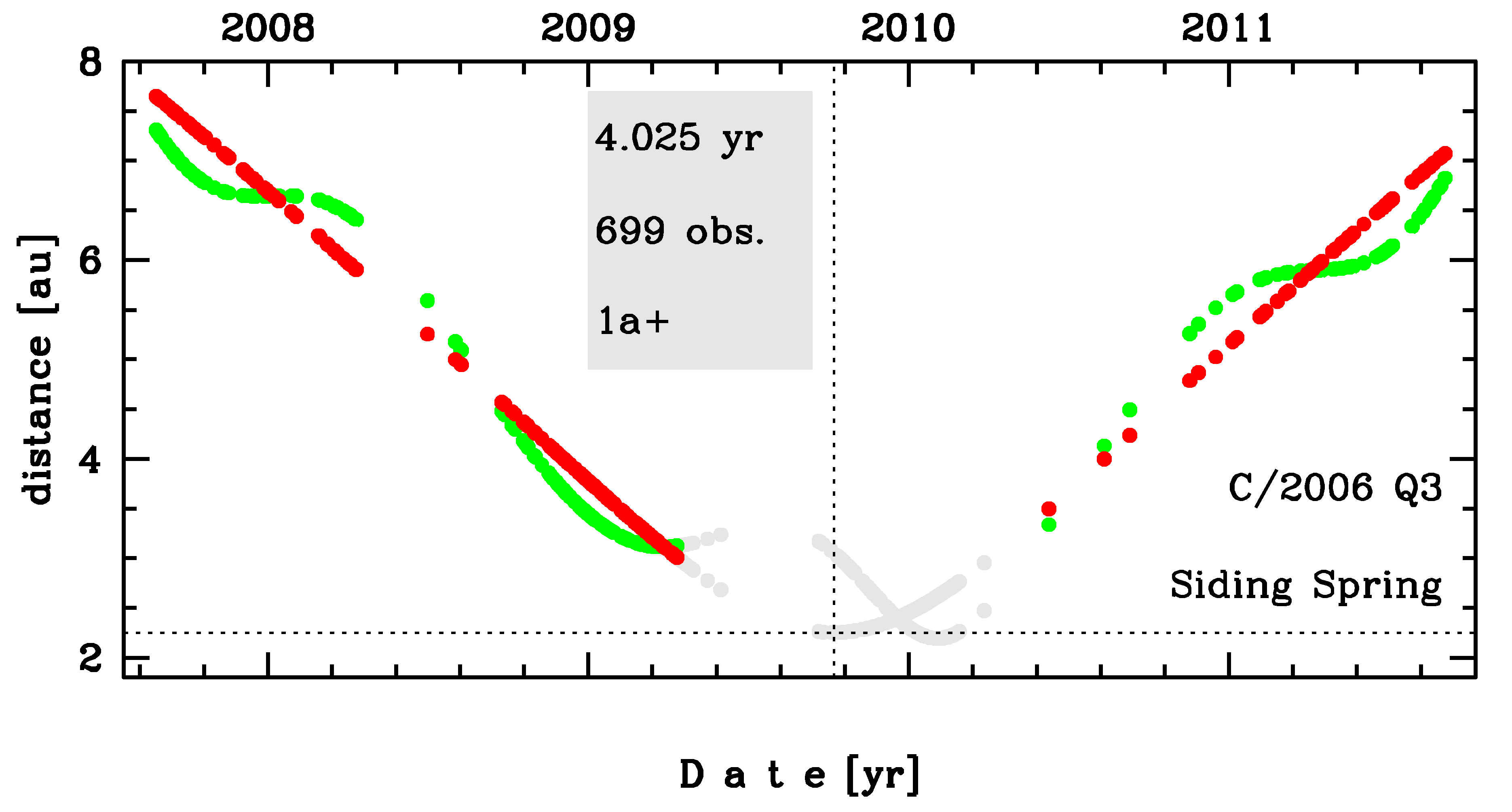 Comet C/2007 Q3 was discovered on 25 August 2007 with Siding Spring survey; that is a bit more than 2 years before its perihelion passage. It was observed until 3 September 2011 (see picture).