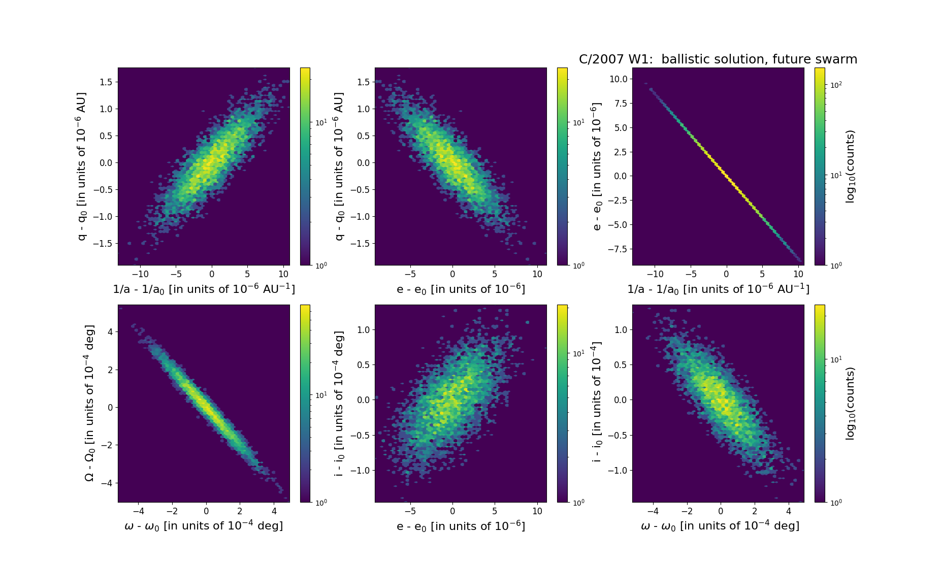 For this comet, a considerable decrease in RMS for the symmetric non-gravitational solution compared with purely gravitational solution was observed, as well as a clear improvement in the amplitude of tendencies in right ascension and declination (compare nn with a5 solutions). A further substantial decrease in RMS occurs when an asymmetrical NG model is used to determine the orbit (n6).This last solution was recomended here as preferred global orbital solution; this solution is based on data spanning over 1.07 yr in a range of heliocentric distances: 3.33 au – 0.850 au (perihelion) – 2.84 au. However, for backward and forward dynamical evolution two separate orbital solutions are given: NG orbit for pre-perihelion arc of data dedicated for past orbital evolution, whereas NG orbit based on post-perihelion data is dedicated to future evolution.The NG parameters for both these NG solutions reveal that on average, the magnitude of NG acceleration obtained using positional data seems to be considerably greater after perihelion than before perihelion. A similar approach was applied earlier by Nakano for C/2007 W1; see Nakano Notes 1731Band Nakano Notes 1731A.