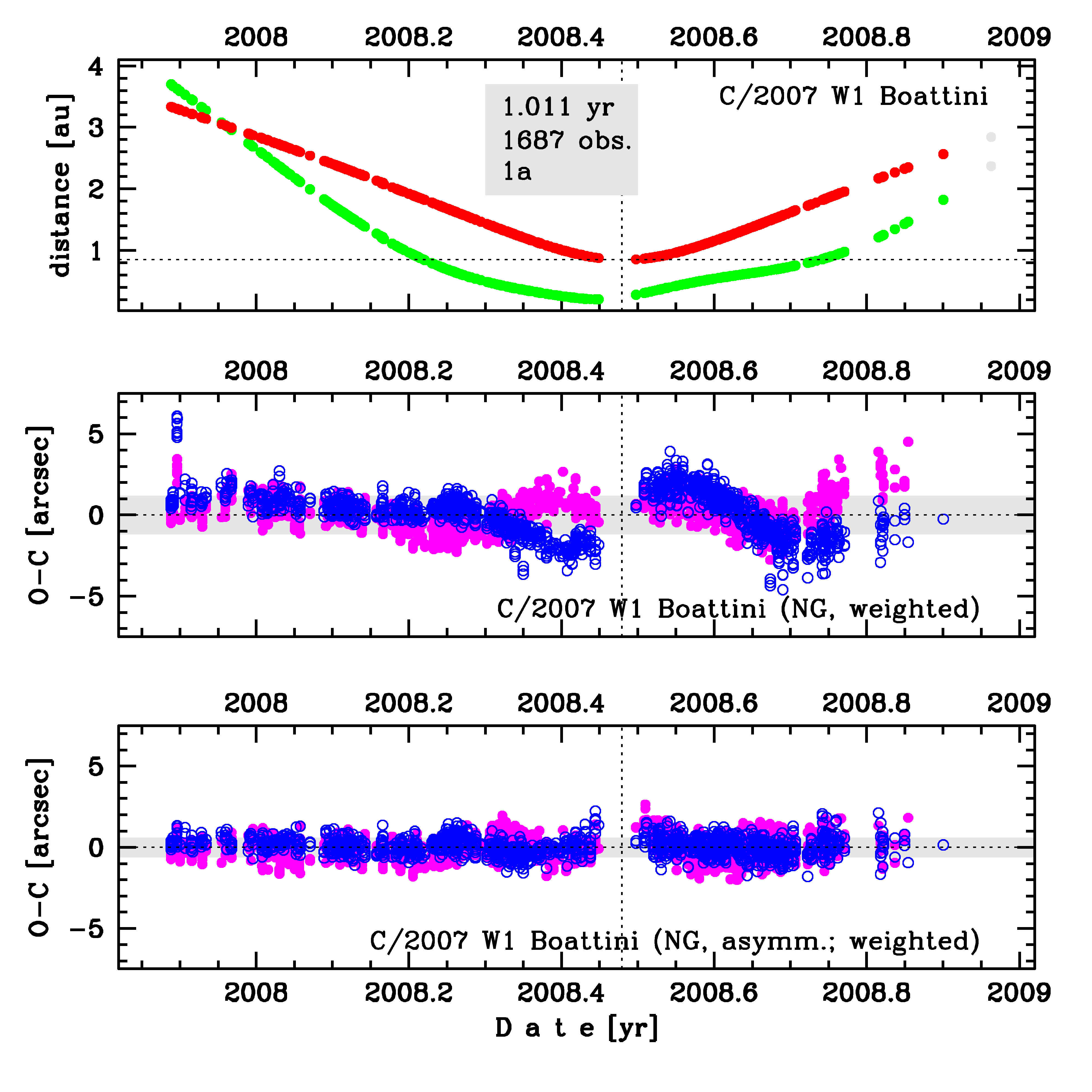 For this comet, a considerable decrease in RMS for the symmetric non-gravitational solution compared with purely gravitational solution was observed, as well as a clear improvement in the amplitude of tendencies in right ascension and declination (compare nn with a5 solutions). A further substantial decrease in RMS occurs when an asymmetrical NG model is used to determine the orbit (n6).This last solution was recomended here as preferred global orbital solution; this solution is based on data spanning over 1.07 yr in a range of heliocentric distances: 3.33 au – 0.850 au (perihelion) – 2.84 au. However, for backward and forward dynamical evolution two separate orbital solutions are given: NG orbit for pre-perihelion arc of data dedicated for past orbital evolution, whereas NG orbit based on post-perihelion data is dedicated to future evolution.The NG parameters for both these NG solutions reveal that on average, the magnitude of NG acceleration obtained using positional data seems to be considerably greater after perihelion than before perihelion. A similar approach was applied earlier by Nakano for C/2007 W1; see Nakano Notes 1731Band Nakano Notes 1731A.