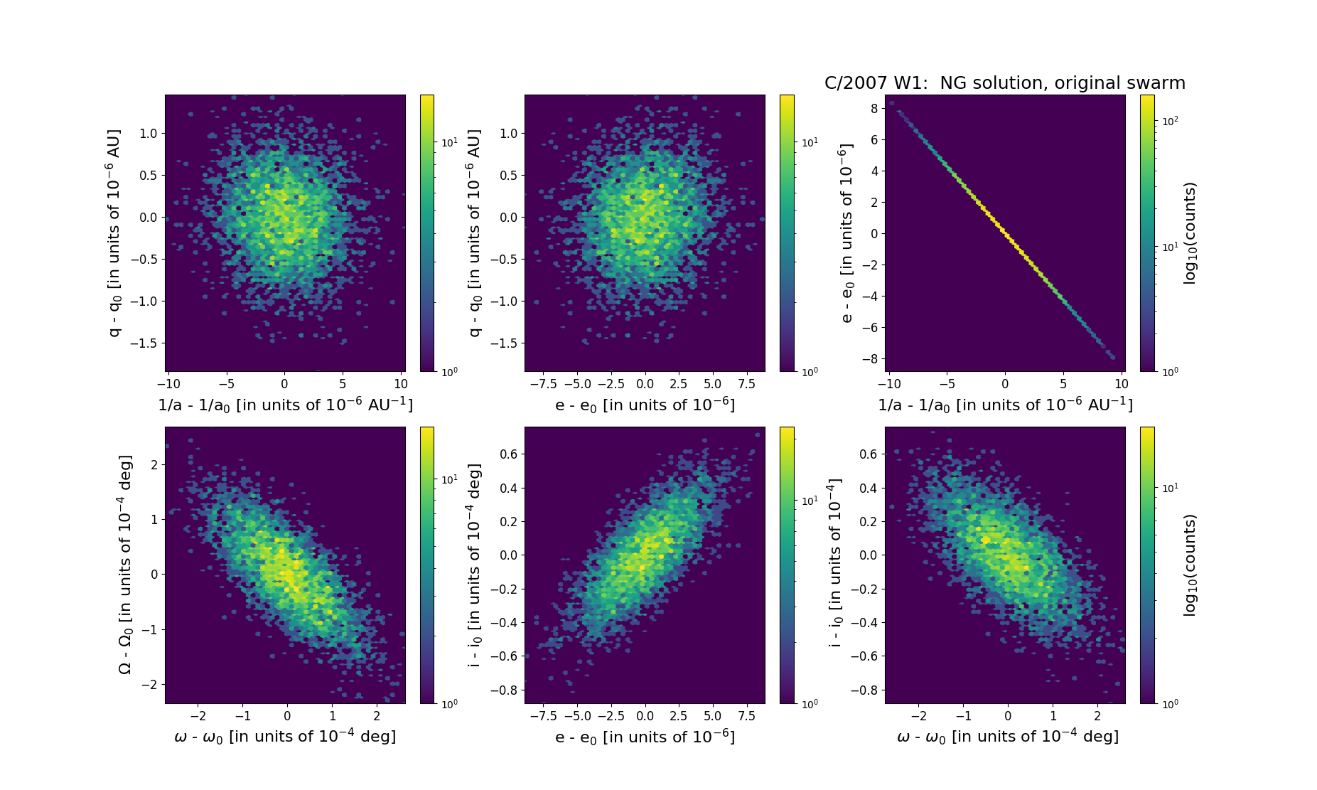 For this comet, a considerable decrease in RMS for the symmetric non-gravitational solution compared with purely gravitational solution was observed, as well as a clear improvement in the amplitude of tendencies in right ascension and declination (compare nn with a5 solutions). A further substantial decrease in RMS occurs when an asymmetrical NG model is used to determine the orbit (n6).This last solution was recomended here as preferred global orbital solution; this solution is based on data spanning over 1.07 yr in a range of heliocentric distances: 3.33 au – 0.850 au (perihelion) – 2.84 au. However, for backward and forward dynamical evolution two separate orbital solutions are given: NG orbit for pre-perihelion arc of data dedicated for past orbital evolution, whereas NG orbit based on post-perihelion data is dedicated to future evolution.The NG parameters for both these NG solutions reveal that on average, the magnitude of NG acceleration obtained using positional data seems to be considerably greater after perihelion than before perihelion. A similar approach was applied earlier by Nakano for C/2007 W1; see Nakano Notes 1731Band Nakano Notes 1731A.