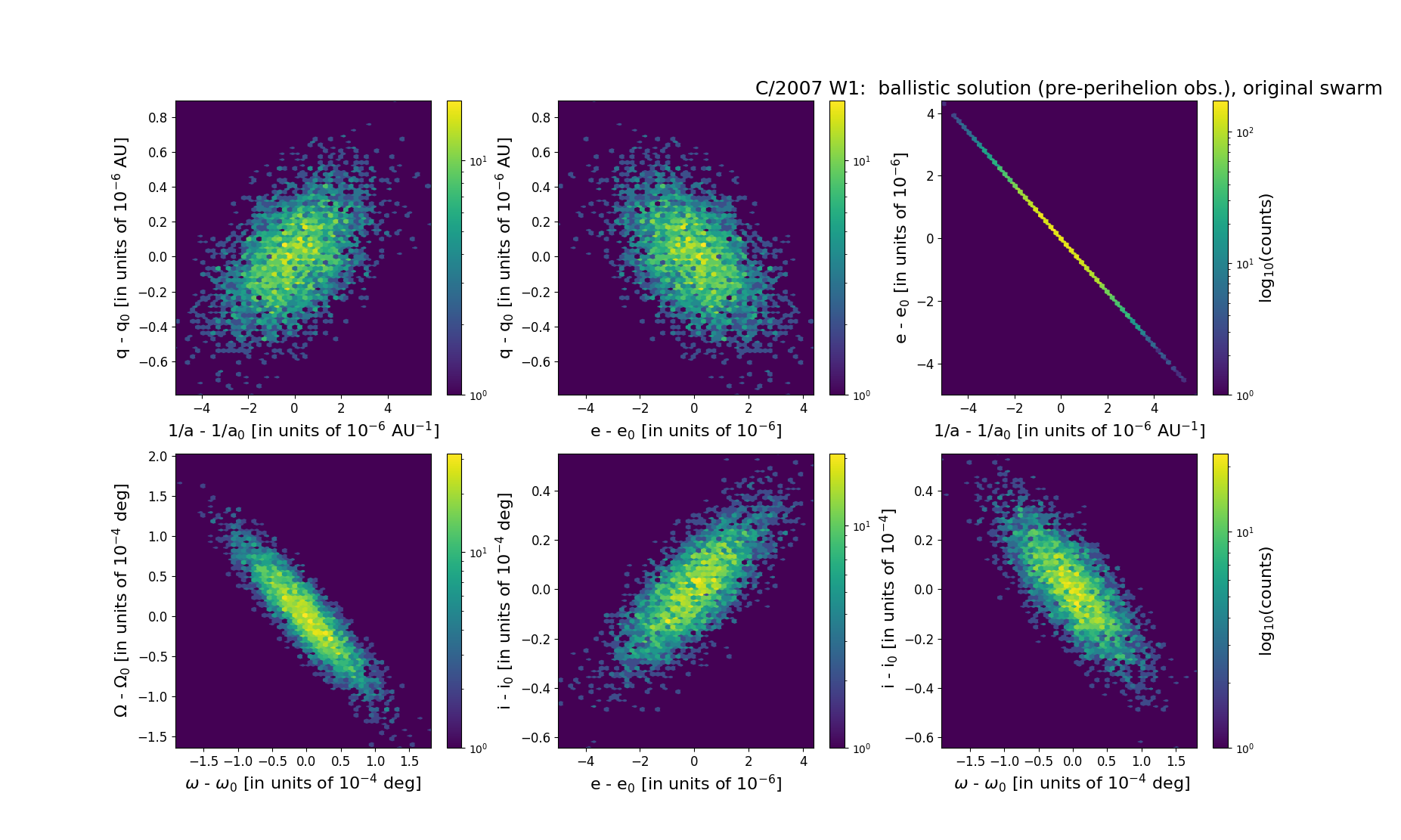 For this comet, a considerable decrease in RMS for the symmetric non-gravitational solution compared with purely gravitational solution was observed, as well as a clear improvement in the amplitude of tendencies in right ascension and declination (compare nn with a5 solutions). A further substantial decrease in RMS occurs when an asymmetrical NG model is used to determine the orbit (n6).This last solution was recomended here as preferred global orbital solution; this solution is based on data spanning over 1.07 yr in a range of heliocentric distances: 3.33 au – 0.850 au (perihelion) – 2.84 au. However, for backward and forward dynamical evolution two separate orbital solutions are given: NG orbit for pre-perihelion arc of data dedicated for past orbital evolution, whereas NG orbit based on post-perihelion data is dedicated to future evolution.The NG parameters for both these NG solutions reveal that on average, the magnitude of NG acceleration obtained using positional data seems to be considerably greater after perihelion than before perihelion. A similar approach was applied earlier by Nakano for C/2007 W1; see Nakano Notes 1731Band Nakano Notes 1731A.