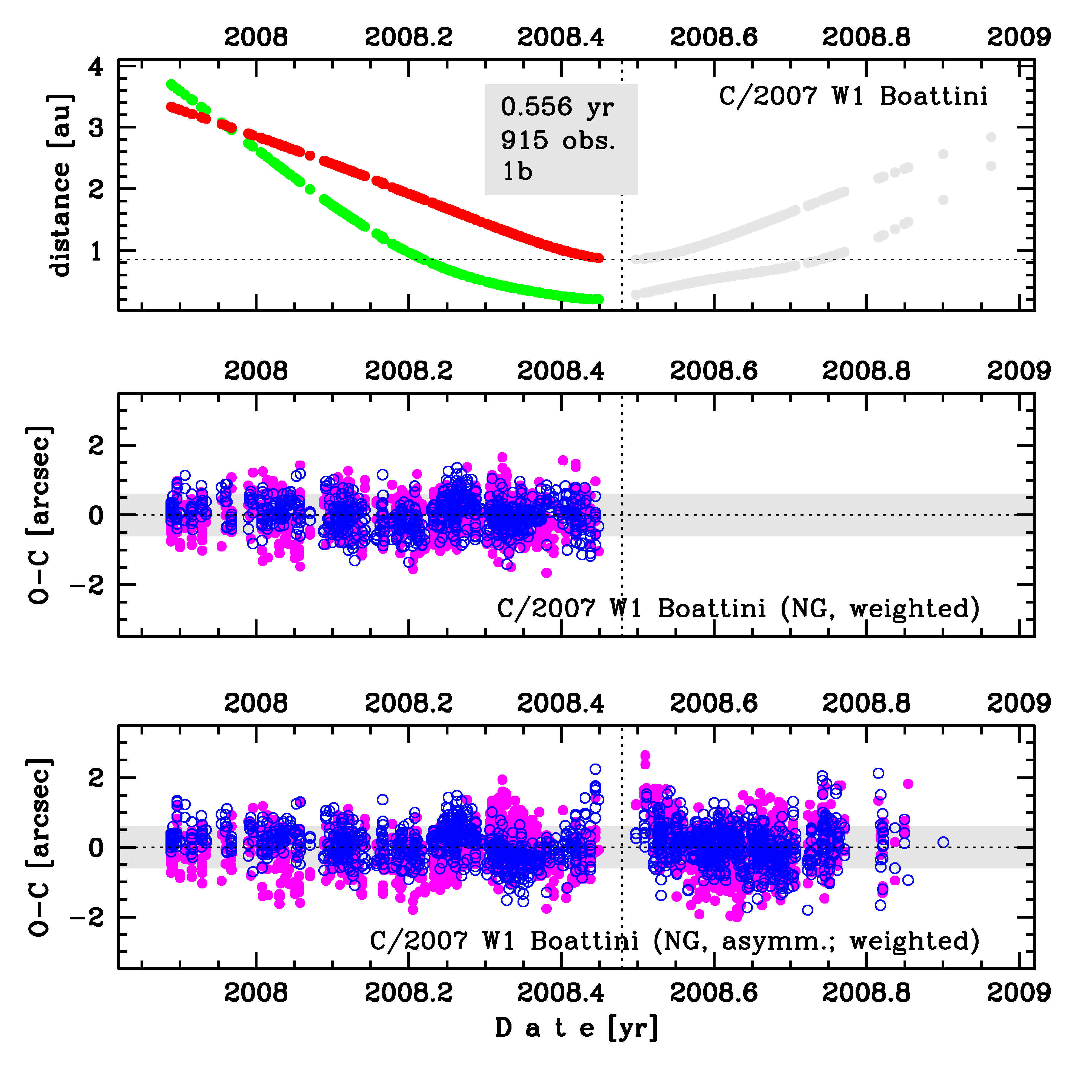 For this comet, a considerable decrease in RMS for the symmetric non-gravitational solution compared with purely gravitational solution was observed, as well as a clear improvement in the amplitude of tendencies in right ascension and declination (compare nn with a5 solutions). A further substantial decrease in RMS occurs when an asymmetrical NG model is used to determine the orbit (n6).This last solution was recomended here as preferred global orbital solution; this solution is based on data spanning over 1.07 yr in a range of heliocentric distances: 3.33 au – 0.850 au (perihelion) – 2.84 au. However, for backward and forward dynamical evolution two separate orbital solutions are given: NG orbit for pre-perihelion arc of data dedicated for past orbital evolution, whereas NG orbit based on post-perihelion data is dedicated to future evolution.The NG parameters for both these NG solutions reveal that on average, the magnitude of NG acceleration obtained using positional data seems to be considerably greater after perihelion than before perihelion. A similar approach was applied earlier by Nakano for C/2007 W1; see Nakano Notes 1731Band Nakano Notes 1731A.