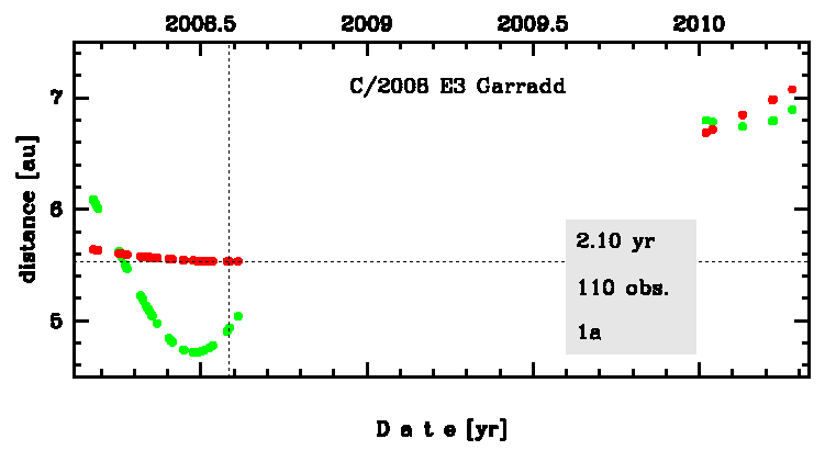 This comet made its closest approach to the Earth on 24 June 2008 (4.715 au), about 3.5 months after its discovery.