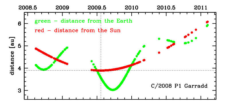 This comet made its closest approach to the Earth on 22 September 2009 (3.028 au), two months after perihelion passage.