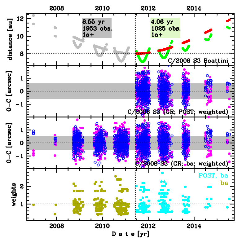 Comet C/2008 S3 was discovered on 29 September 2008, that is 4.5 yr before perihelion passage. Later, three series of pre-discovery measurements were found: from 2007 December 18 (Mt Lemmon Survey, 12.4 au from the Sun), 2007 December 4 (Catalina Sky Survey, 11.0 au), and 2006 December 27 (Mt Lemmon Survey, 10.9 au). Each of these series consists of four measurements. Thus, data arc covers 8.6,yr in a heliocentric distance range of 12.4 au – 8.015 au (perihelion) – 11.9 au.