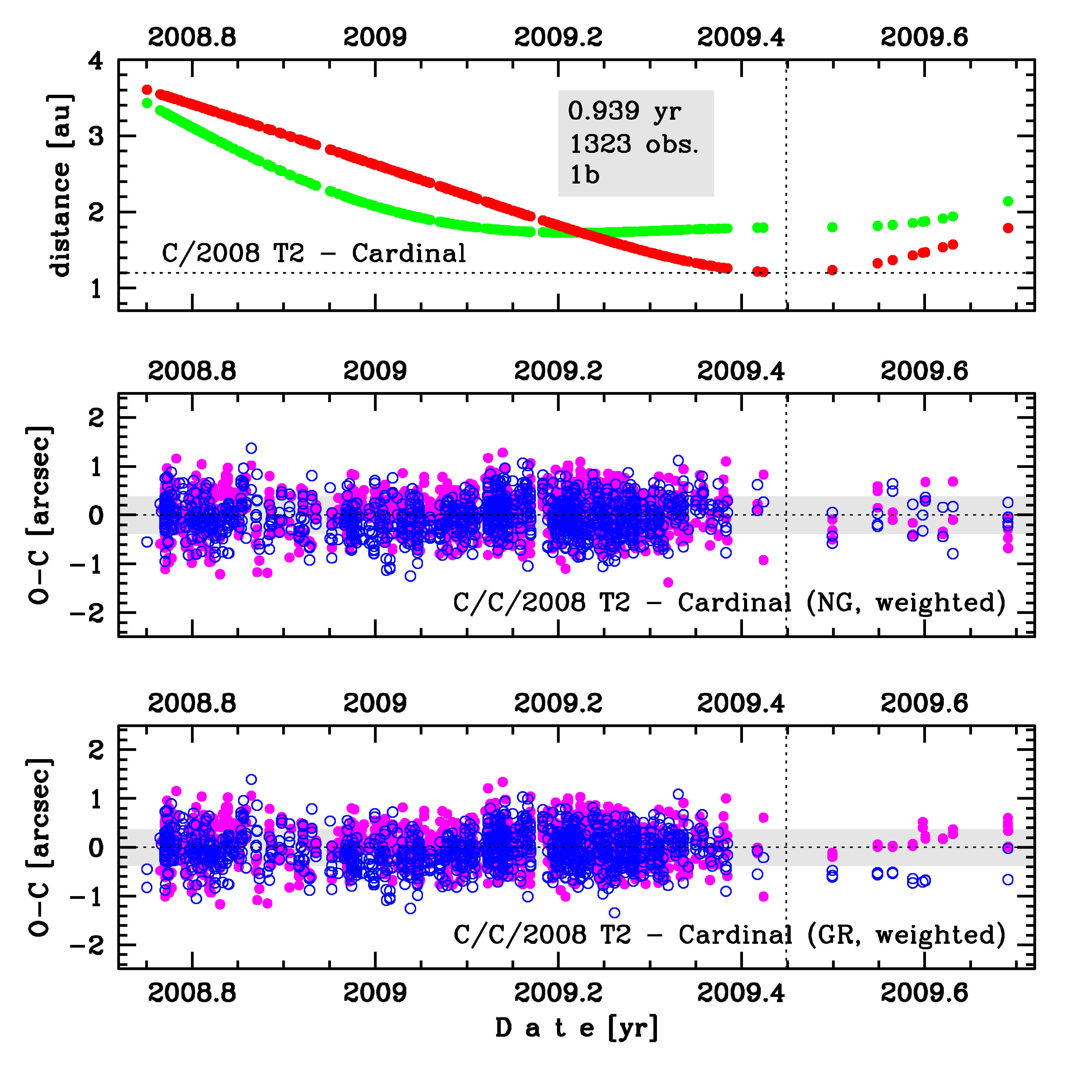 Comet C/2008 T2 was discovered on 1 October 2008 by Rob D. Cardinal (University of Calgary, Priddis); that is about 8.5 months before its perihelion passage. The comet was observed until 9 September 2009.
