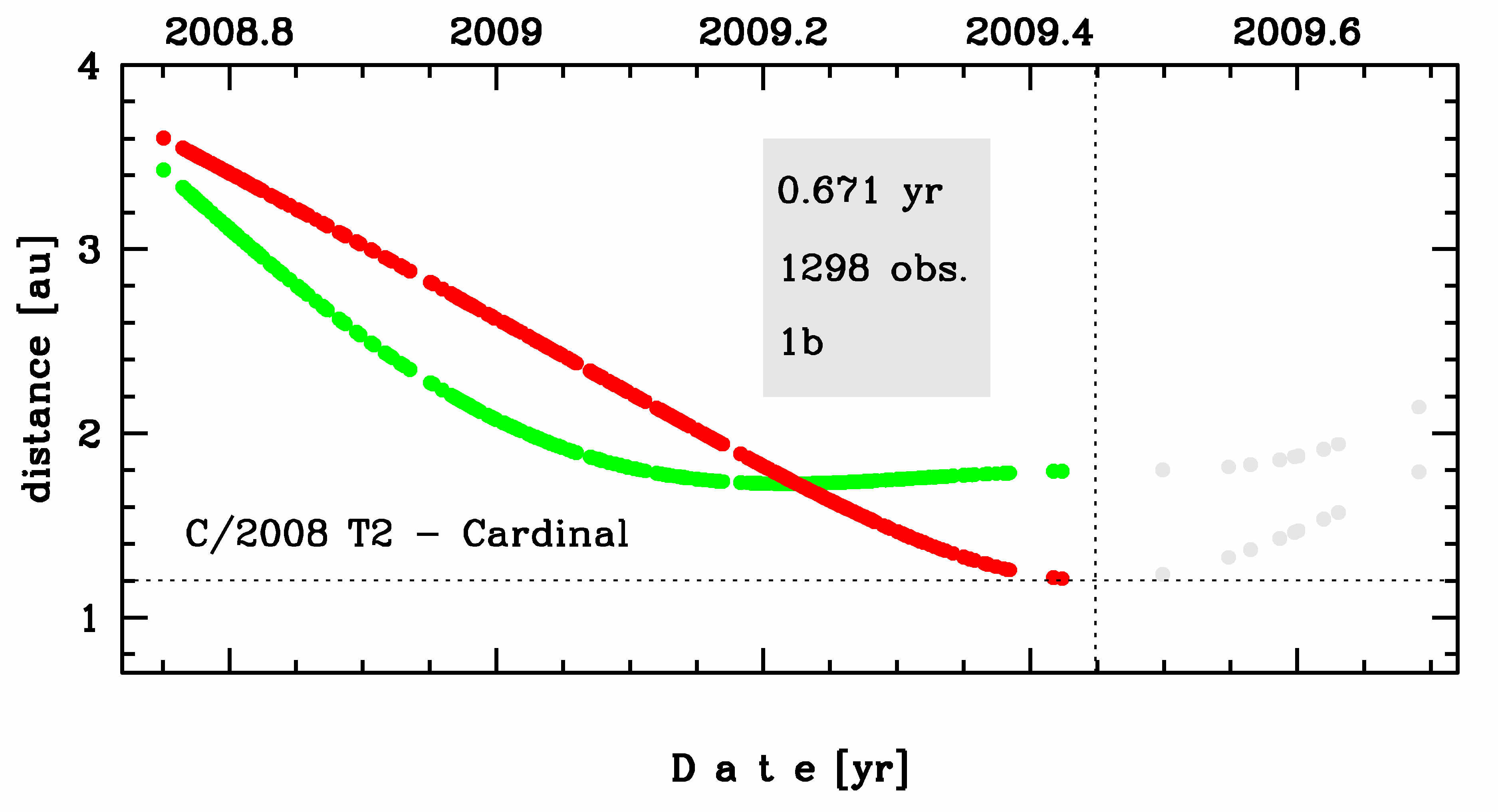 Comet C/2008 T2 was discovered on 1 October 2008 by Rob D. Cardinal (University of Calgary, Priddis); that is about 8.5 months before its perihelion passage. The comet was observed until 9 September 2009.