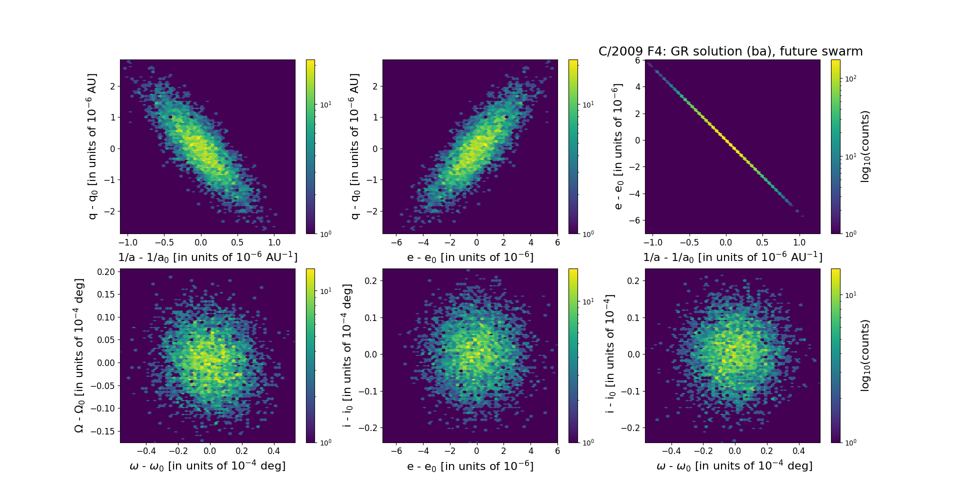 Six 2D-projections of the 6D space of future swarm including 5001 VCs. Each density map is given in logarithmic scale presented on the right in the individual panel.