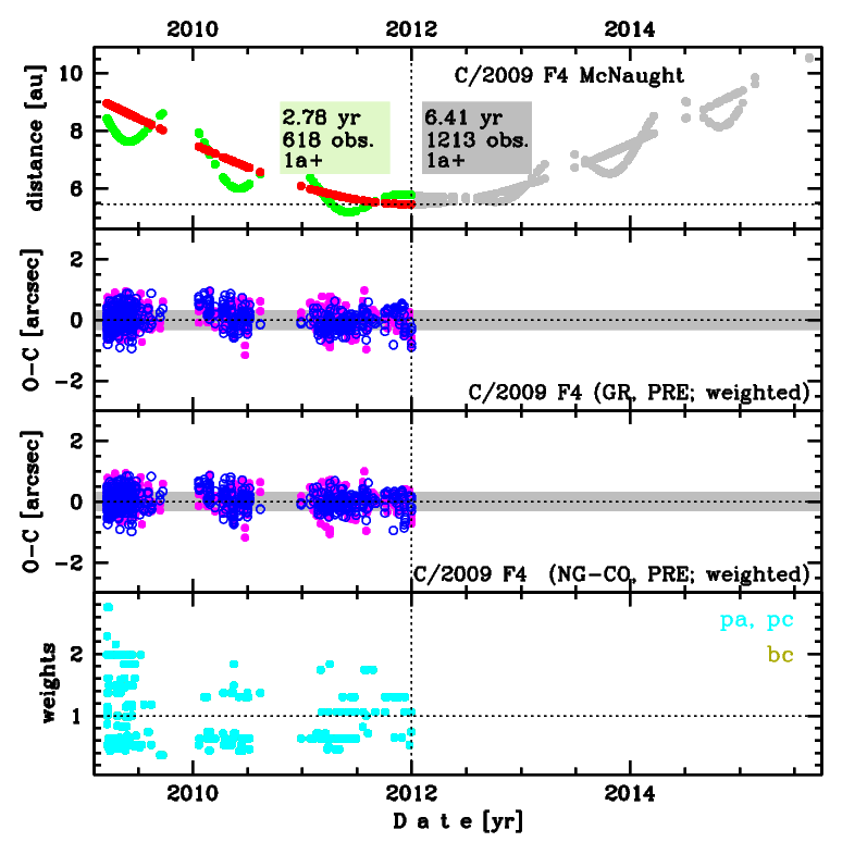 Comet C/2009 F4 was discovered on 19 March 2009, that is 2.8 yr before perihelion passage, and next was observed 6.4 yr during seven oppositions in a range of heliocentric distances: 8.96 au – 5.455 au (perihelion) – 10.5 au.