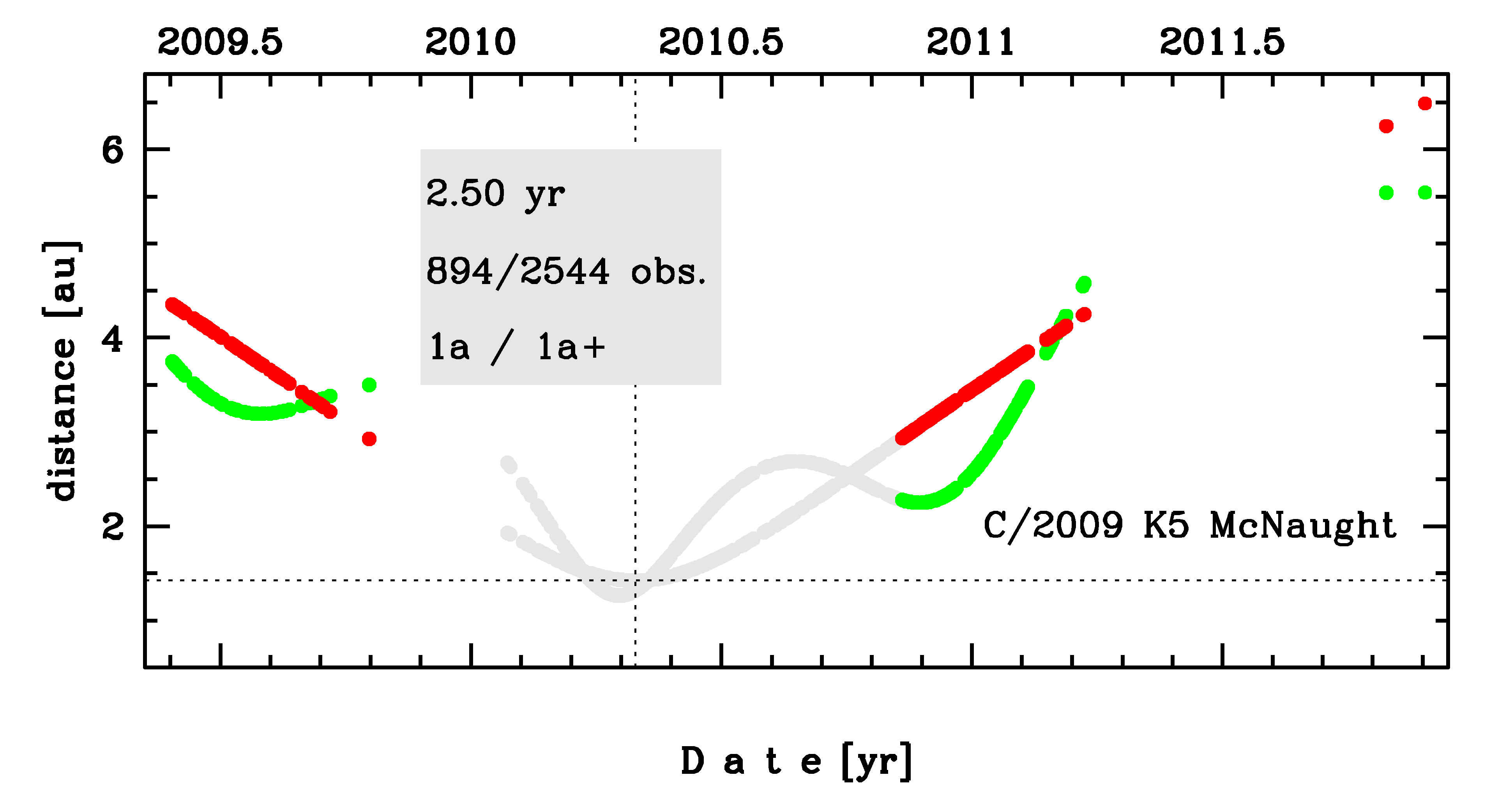 Comet C/2009 K5 was discovered on 27 May 2009 by Robert H. McNaught (Siding Spring); that is about 11 months before its perihelion passage. The comet was observed until 26 October 2011.