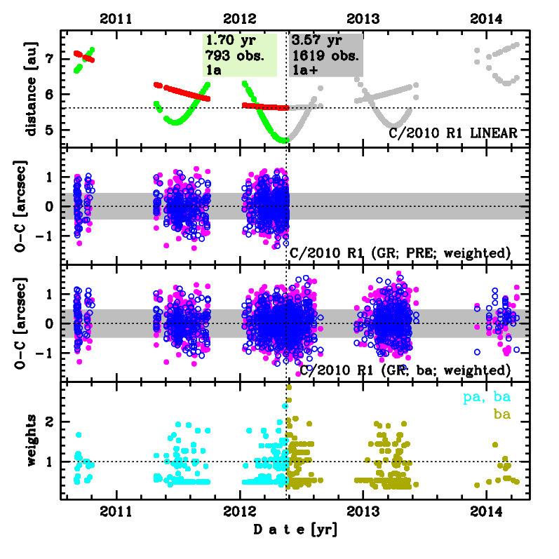 Comet C/2010 R1 was discovered on 4 September 2010 and next observed 3.6 yr in a range of heliocentric distances: 7.15 au – 5.621 au (perihelion) – 7.40 au. At the moment of discovery, it was 1.7 yr before perihelion passage (see figure).