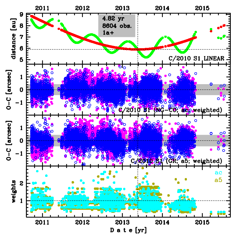 Comet C/2010 S1 was discovered on 21 September 2010 and next observed almost continuously by 4.8 yr in a range of heliocentric distances: 8.85 au – 5.900 au (perihelion) – 8.02 au. At the moment of discovery, it was two years and eight months before perihelion passage (see figure).