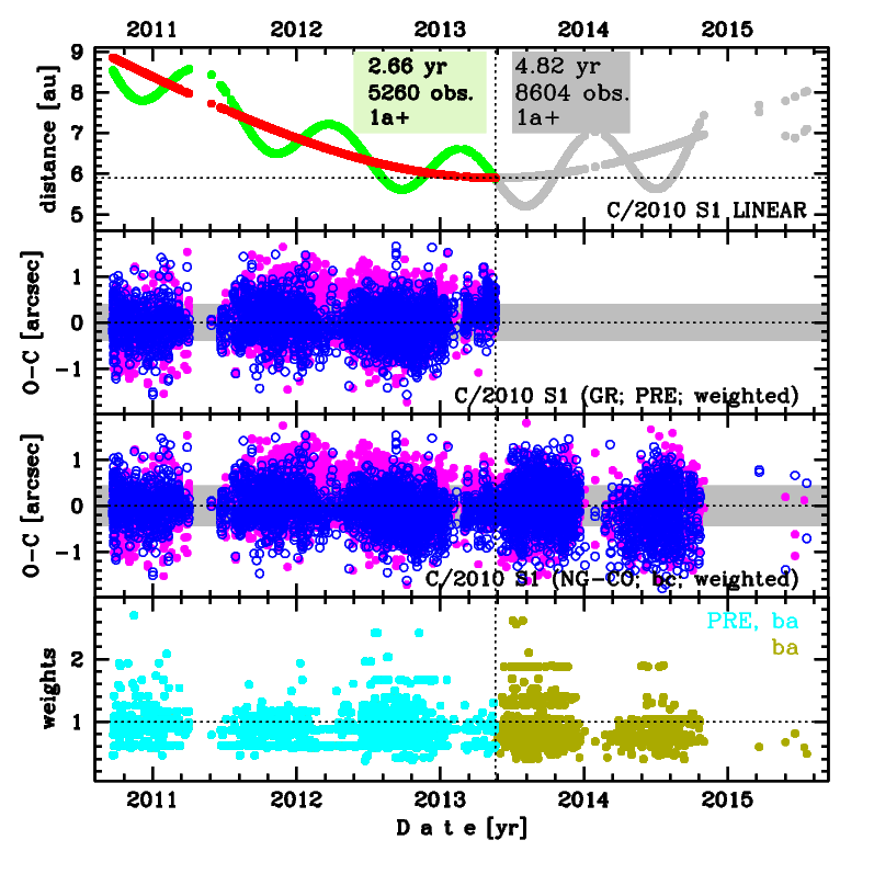 Comet C/2010 S1 was discovered on 21 September 2010 and next observed almost continuously by 4.8 yr in a range of heliocentric distances: 8.85 au – 5.900 au (perihelion) – 8.02 au. At the moment of discovery, it was two years and eight months before perihelion passage (see figure).