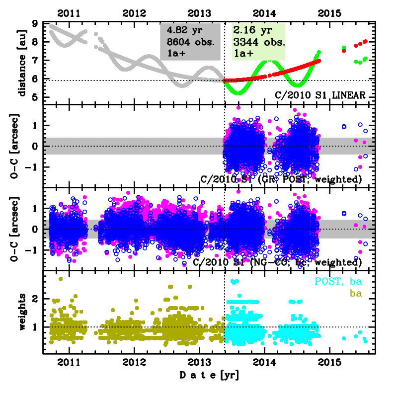 Comet C/2010 S1 was discovered on 21 September 2010 and next observed almost continuously by 4.8 yr in a range of heliocentric distances: 8.85 au – 5.900 au (perihelion) – 8.02 au. At the moment of discovery, it was two years and eight months before perihelion passage (see figure).