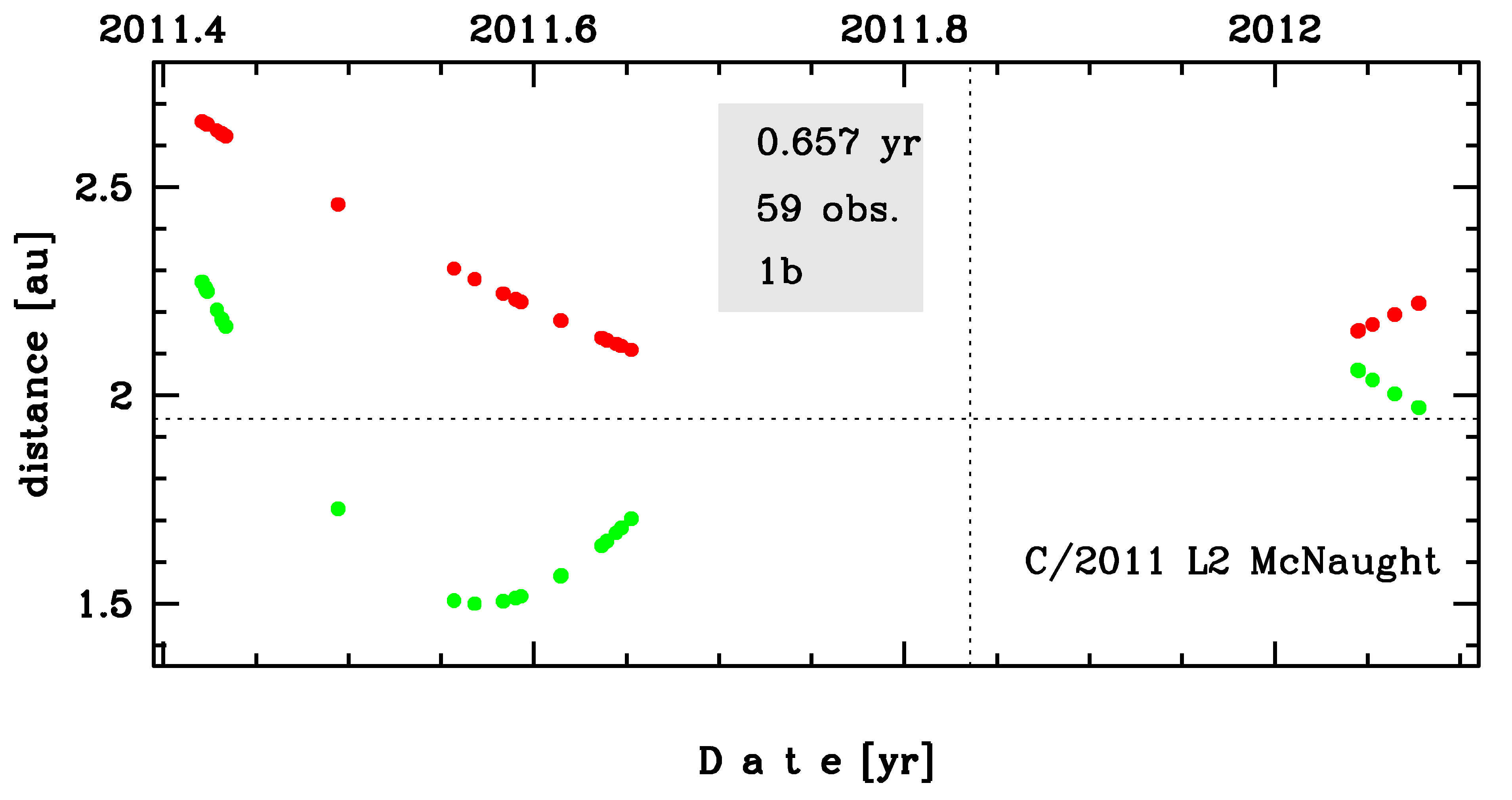 Solutions given here are based on data spanning over 0.657 yr in a range of heliocentric distances: 2.66 au – 1.943 au (perihelion) – 2.22 au. The non-gravitational solution was chosen as preferred orbit; however, uncertainties of NG parameters are large.