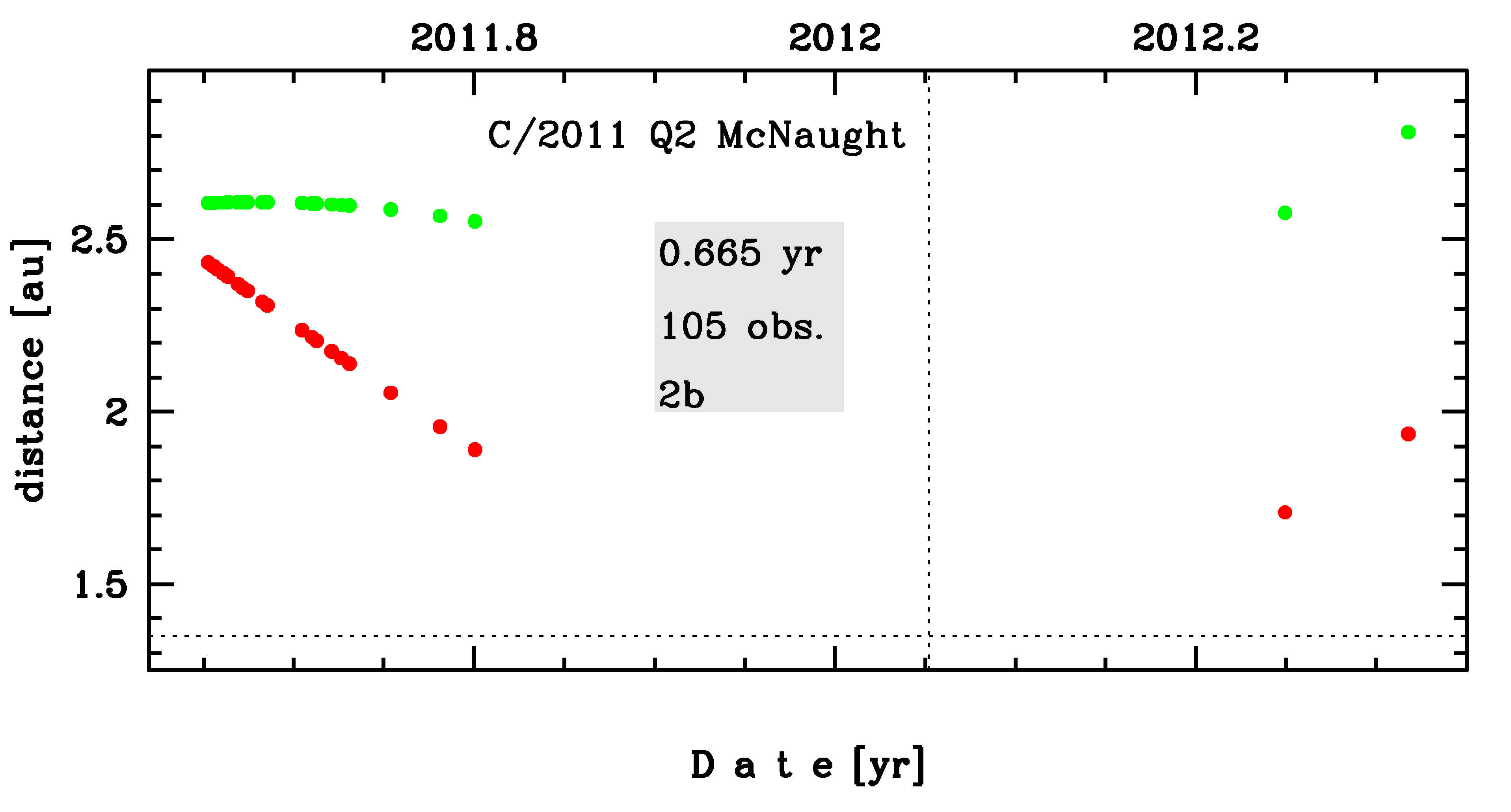 Comet C/2011 Q2 was discovered on 26 August 2011 by Robert H. McNaught (Siding Spring), that is almost 5 months before its perihelion passage. It was observed until 26 April 2012.