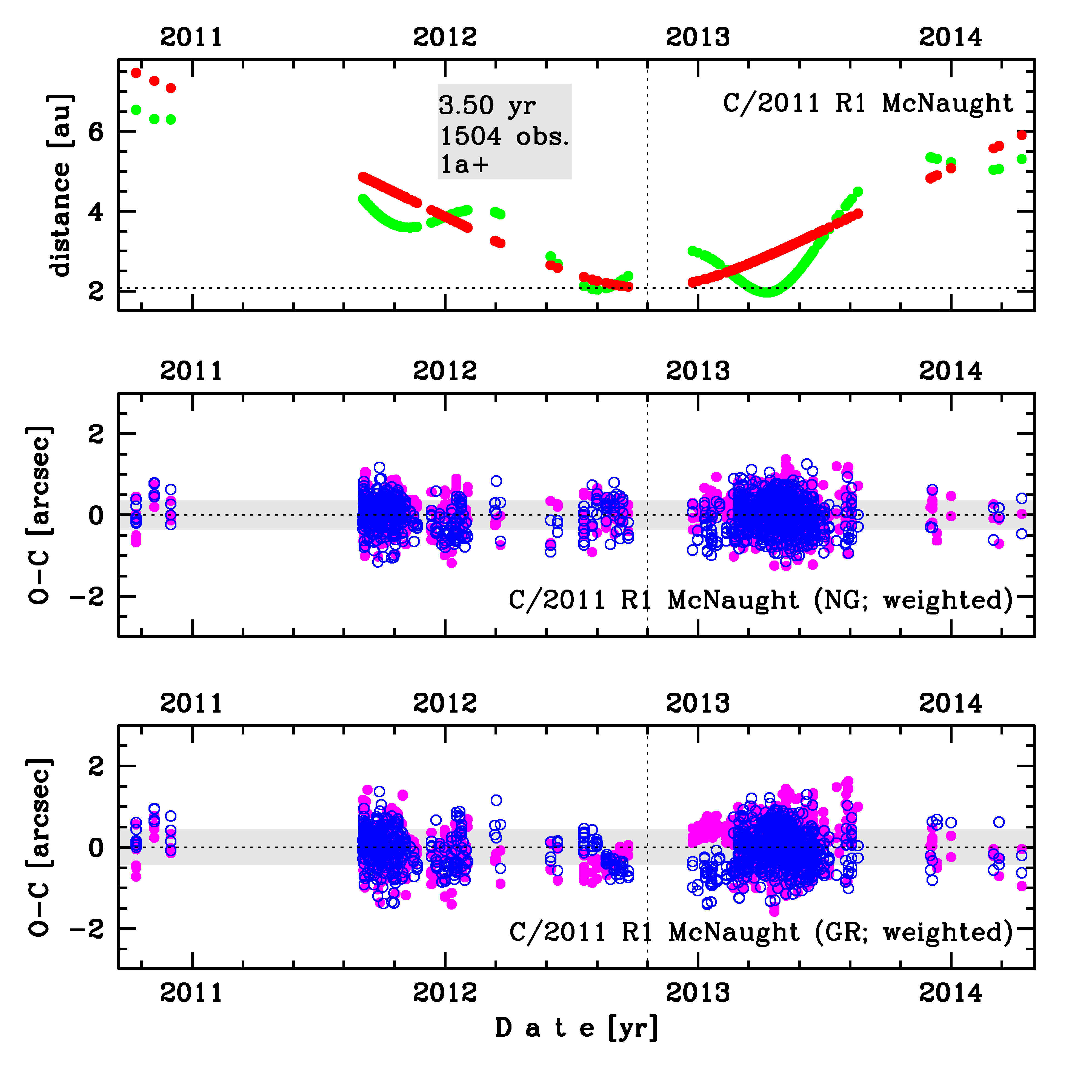 Comet C/2011 R1 was discovered on 3 September 2011 by Robert H. McNaught (Siding Spring), that is more than a year before its perihelion passage. It was observed until 11 April 2014.
