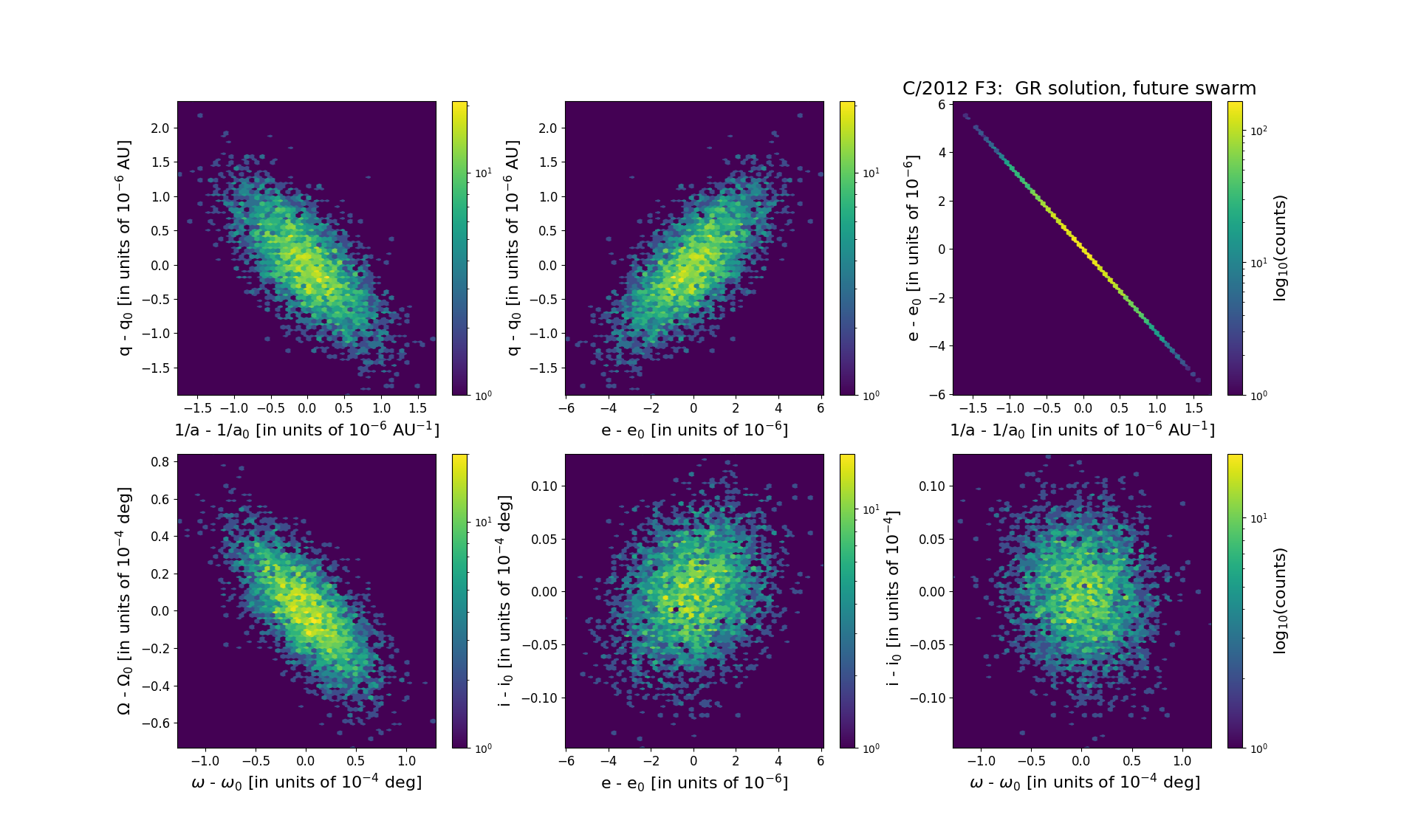 Six 2D-projections of the 6D space of future swarm including 5001 VCs. Each density map is given in logarithmic scale presented on the right in the individual panel.