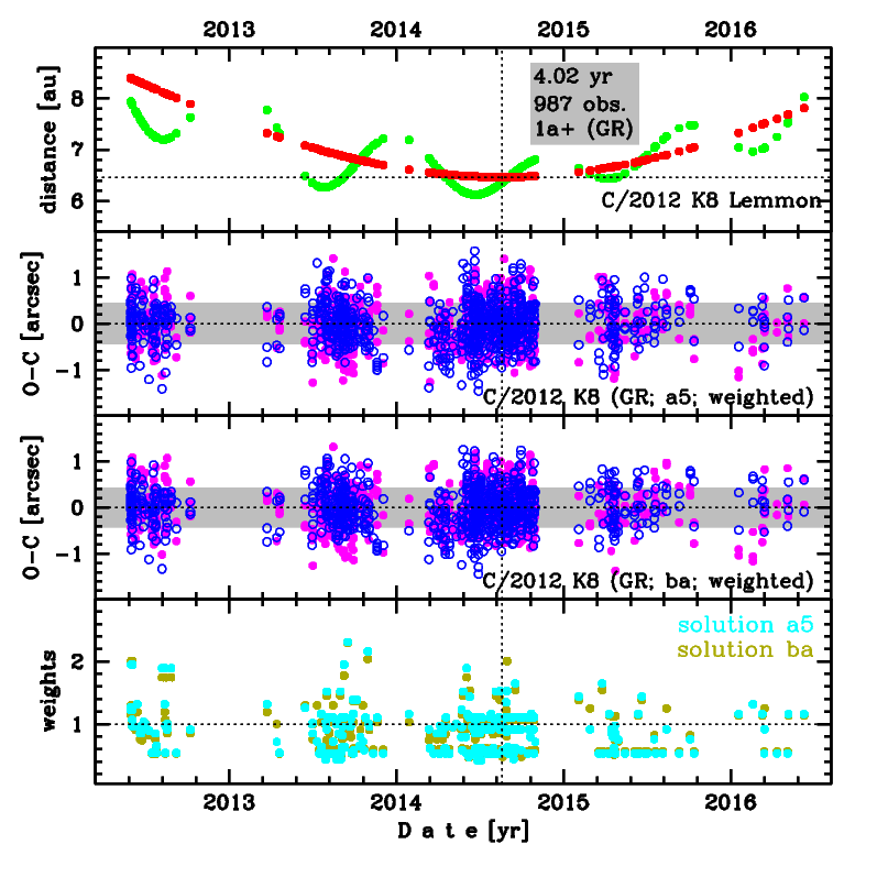 Comet C/2012 K8 was discovered on 30 May 2012 with Mount Lemmon survey, that is about 2.2 years before its perihelion passage. It was observed during five oppositions until 8 June 2016.