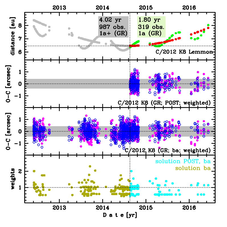 Comet C/2012 K8 was discovered on 30 May 2012 with Mount Lemmon survey, that is about 2.2 years before its perihelion passage. It was observed during five oppositions until 8 June 2016.