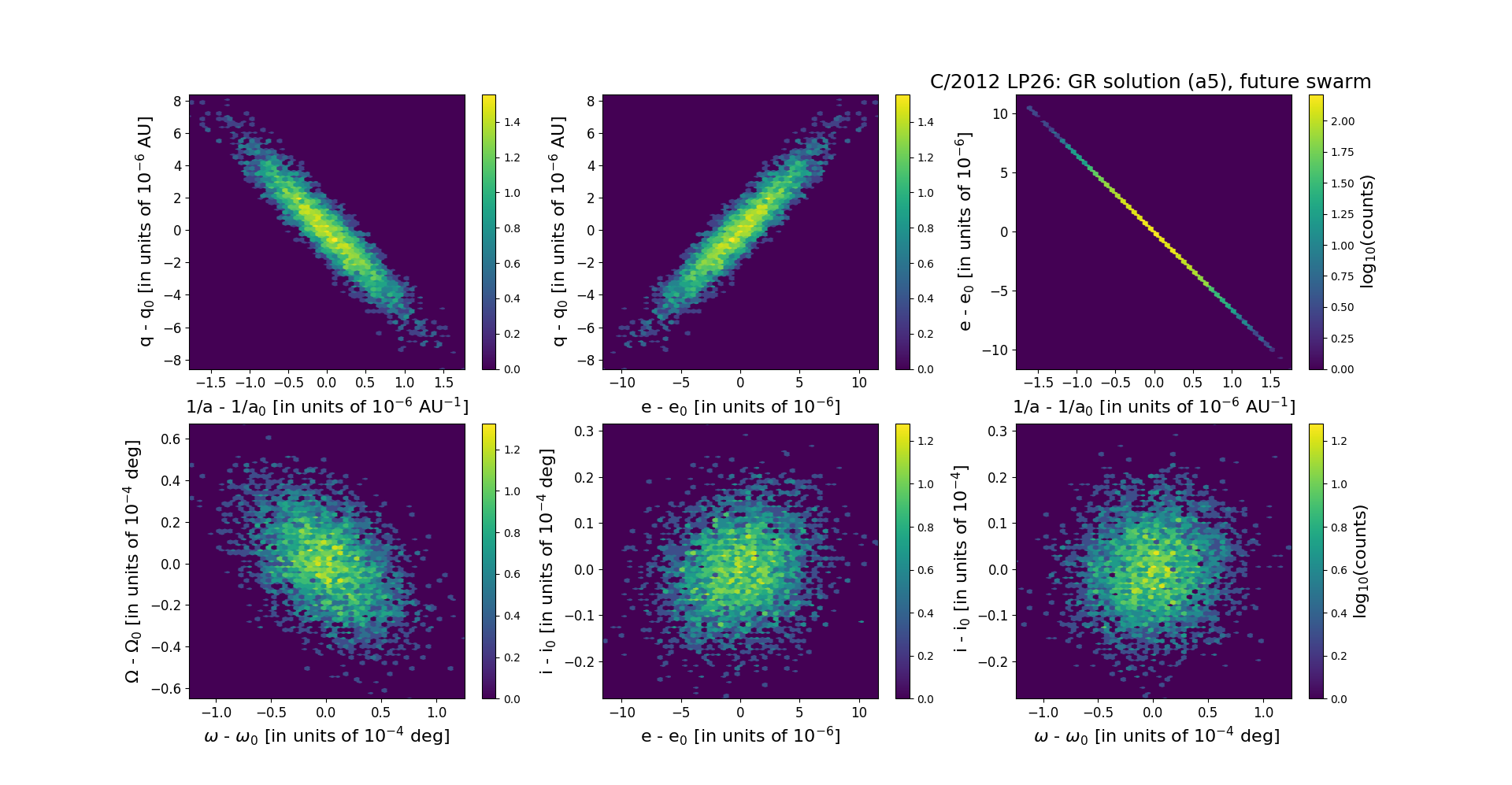 Six 2D-projections of the 6D space of future swarm including 5001 VCs. Each density map is given in logarithmic scale presented on the right in the individual panel.