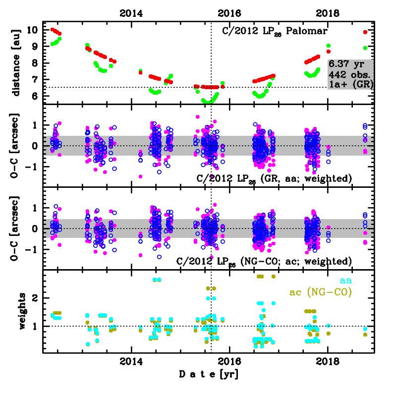 Solutions given here are based on data spanning over 6.37 yr in a range of heliocentric distances: 10.02 au – 6.536 au (perihelion) – 9.86 au (5 October 2018).