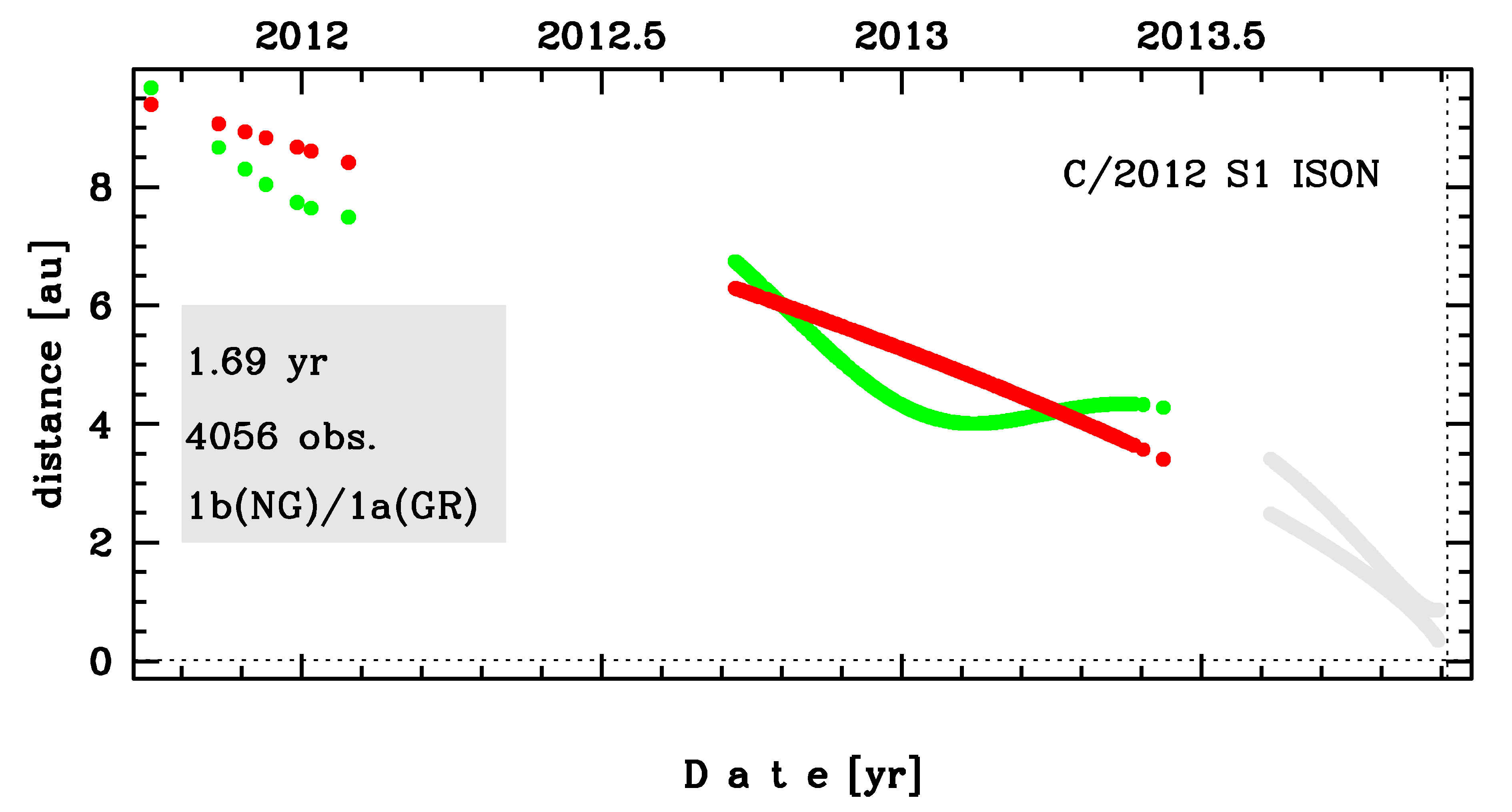 Therefore, two orbits worth noting here are based on data taken at large heliocentric distances (more than 3.4 au from the Sun, solutions: pa, pc) and before the two-month gap starting from 9 June 2013 (see picture). The first orbit is purely GR and gives original 1/a as nearly zero, whereas the second one is an NG orbit obtained using the g(r)-like formula describing CO sublimation. Here this last orbit was taken as preffered orbit.