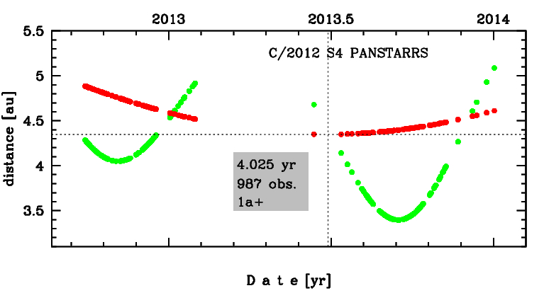 Comet C/2012 S4 was discovered on 28 September 2012 with Pan-STARRS 1 telescope (Haleakala), that is nine months before its perihelion passage. It was observed during two oppositions until 1 January 2014.