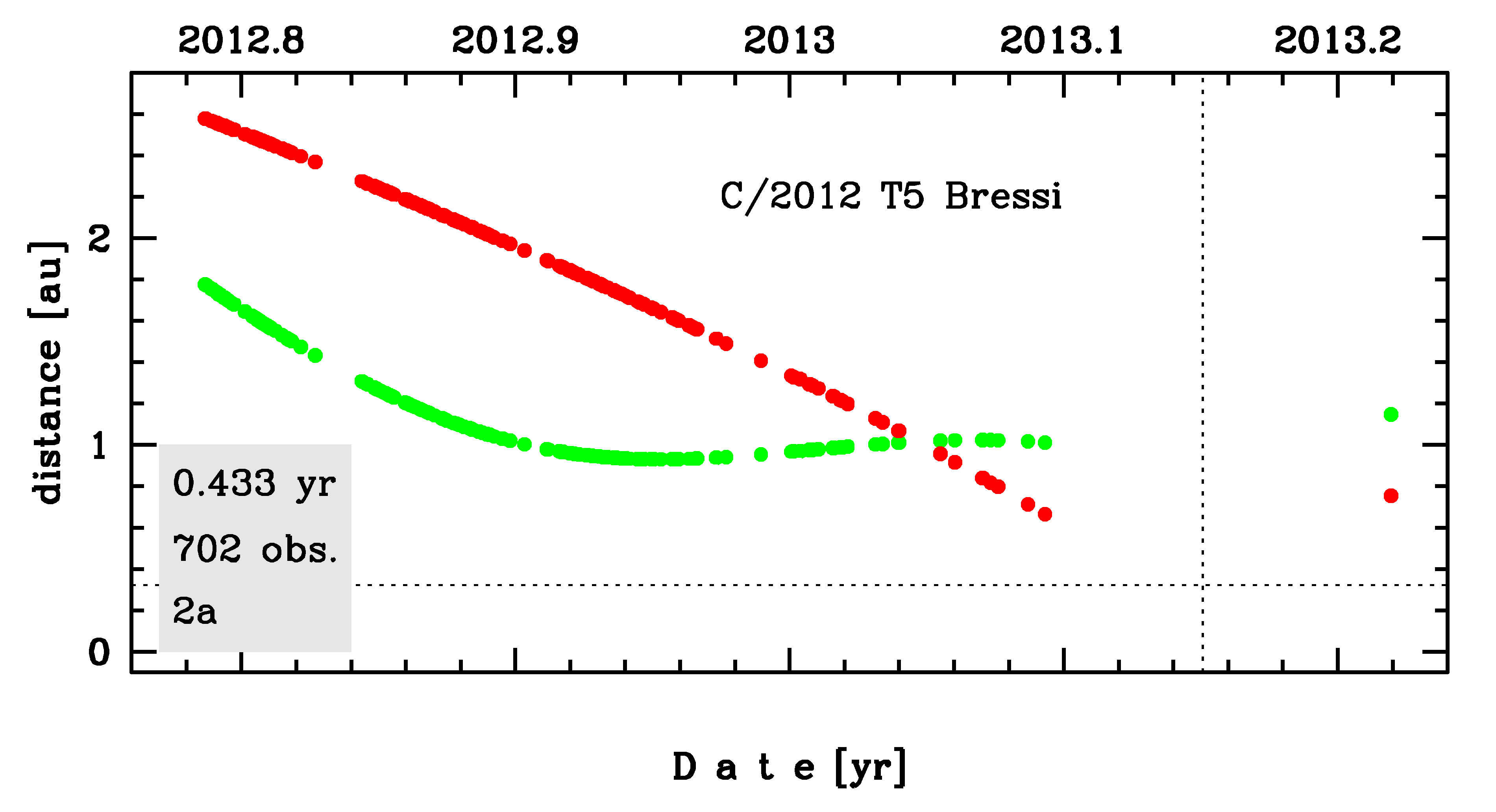 C/2012 T5 had its closest approach to the Earth on 25 February 2013 (0.913 au), a day after its perihelion passage.