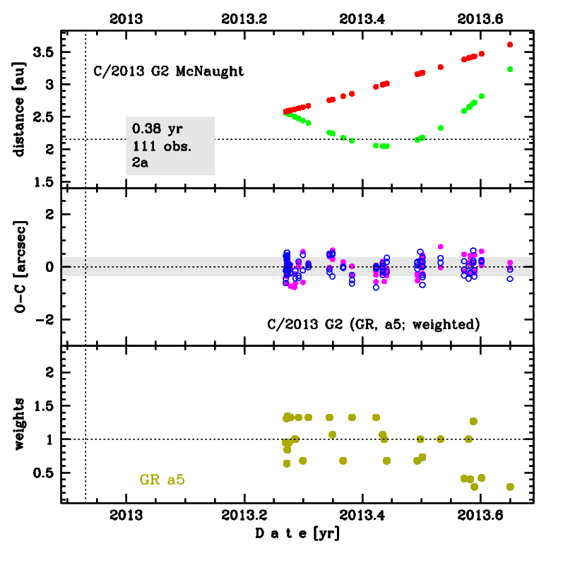 Comet C/2013 G2 was discovered on 8 April 2013 by Robert H. McNaught (Siding Spring), that is about 4 months after its perihelion passage. Next, it was followed more about 4.5 months until August 25. Comet had its closest approach to the Earth on 8 June 2013 (2.05 au, 2 months after discovery).