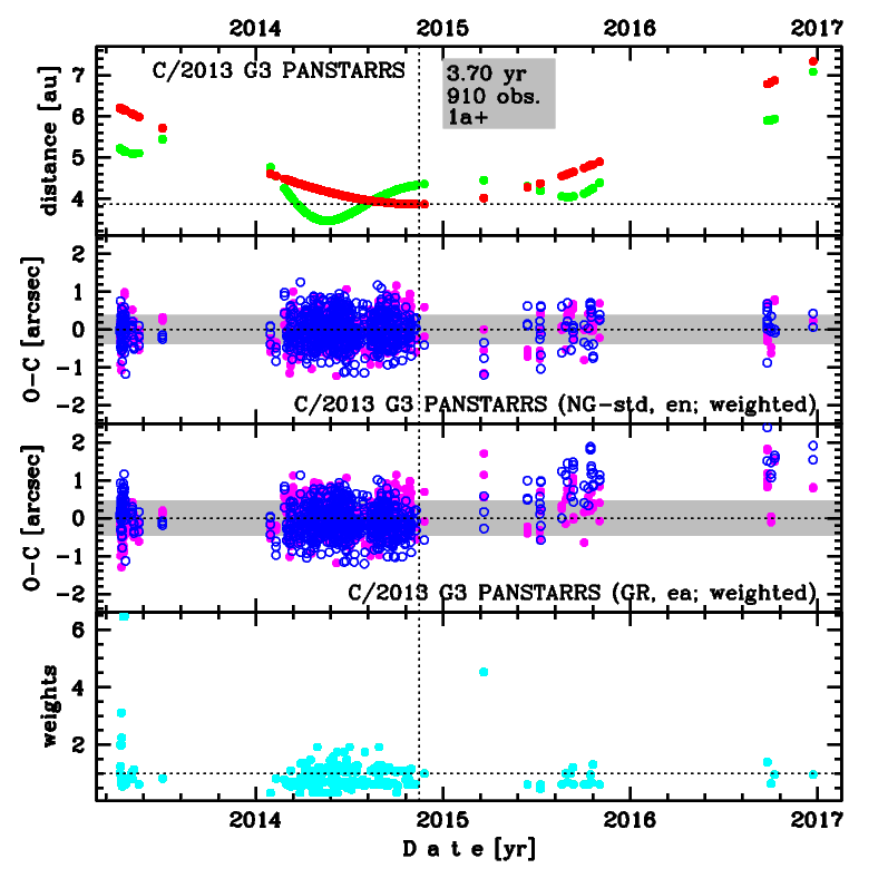 Comet C/2013 G3 was discovered on 10 April 2013 with Pan-STARRS 1 telescope (Haleakala), that is 1.6 yr before its perihelion passage. It was observed during four oppositions until 23 December 2016.