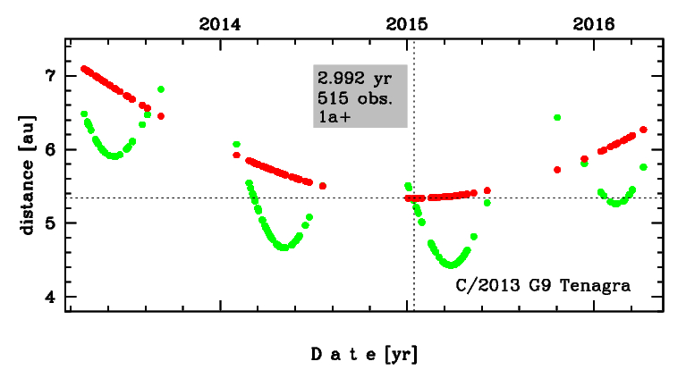 Comet C/2013 G9 was discovered on 15 April 2013 with Tenagra II telescope (near Nogales, U.S.A.), that is a year and 9 months before its perihelion passage. Soon, it was found on earlier images taken on 9 April 2013 with the VHS-VISTA, Cerro Paranal. This comet was observed during four oppositions until 6 April 2016.