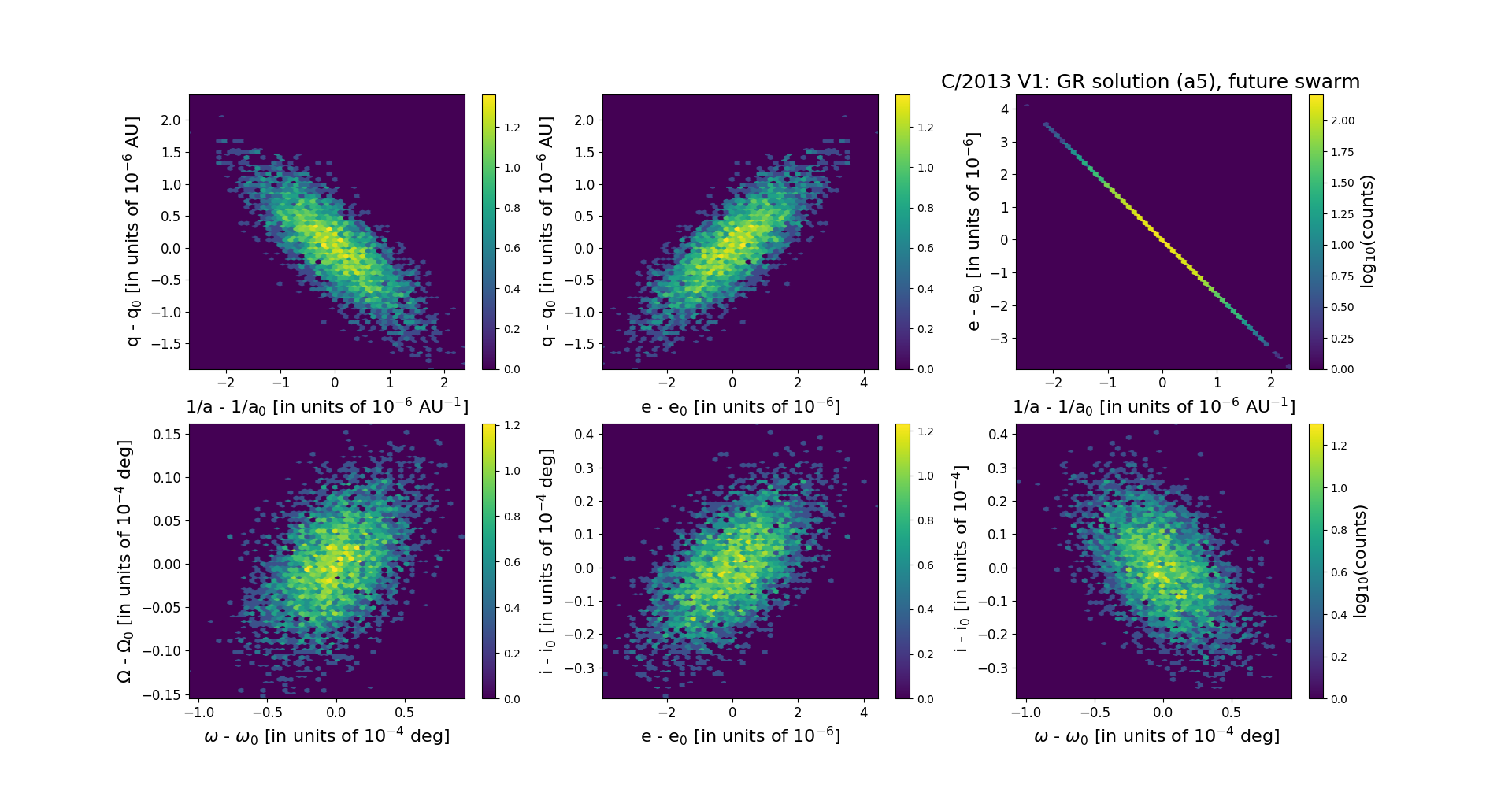 Six 2D-projections of the 6D space of future swarm including 5001 VCs. Each density map is given in logarithmic scale presented on the right in the individual panel.