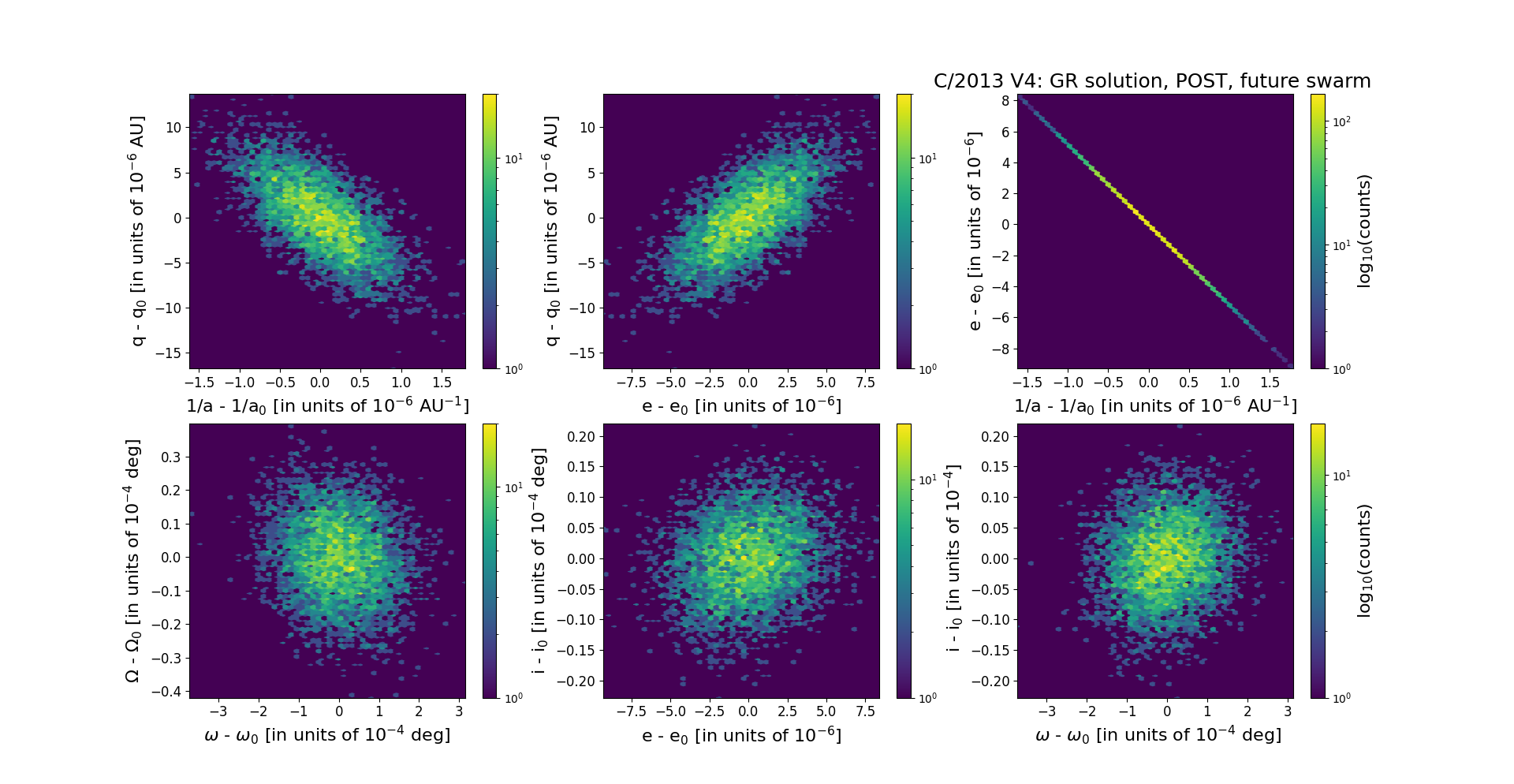 This Oort spike comet suffers slight planetary perturbations during its passage through the planetary system; these perturbations lead to a more tight future orbit (see future barycentric orbits).