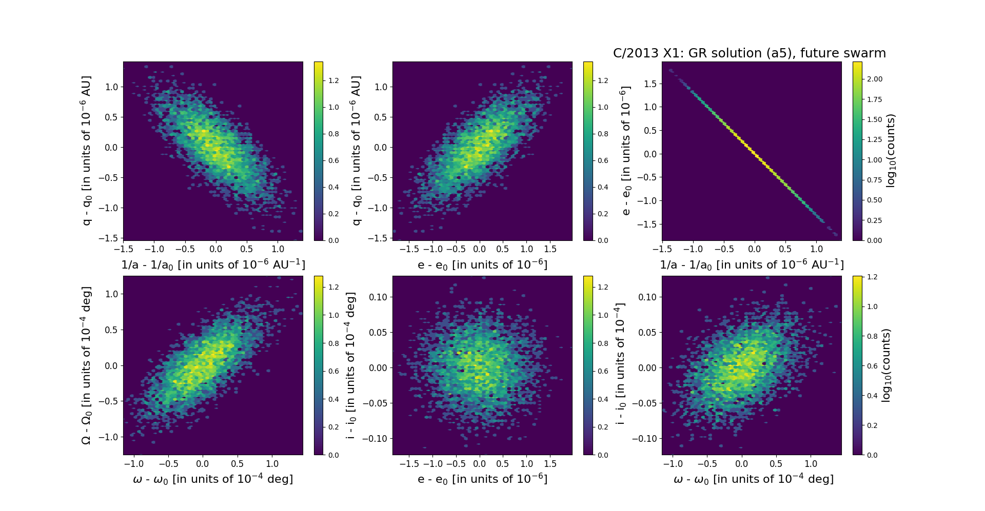 This is the comet with NG effects strongly manifested in positional data fitting. Solutions 'a5' (GR), 'n5' (NG), and t4 (asymm. NG, preferred orbit) are based on data spanning over 4.3 yr in a range of heliocentric distances: 9.25 au – 1.314 au (perihelion) – 7.17 au. Also NG orbit based on distant part of pre-perihelion leg of orbit was possible to obtain (see solution 'pd').