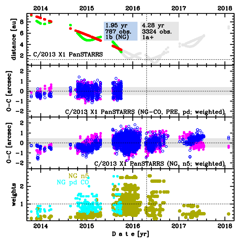 This is the comet with NG effects strongly manifested in positional data fitting. Solutions 'a5' (GR), 'n5' (NG), and t4 (asymm. NG, preferred orbit) are based on data spanning over 4.3 yr in a range of heliocentric distances: 9.25 au – 1.314 au (perihelion) – 7.17 au. Also NG orbit based on distant part of pre-perihelion leg of orbit was possible to obtain (see solution 'pd').