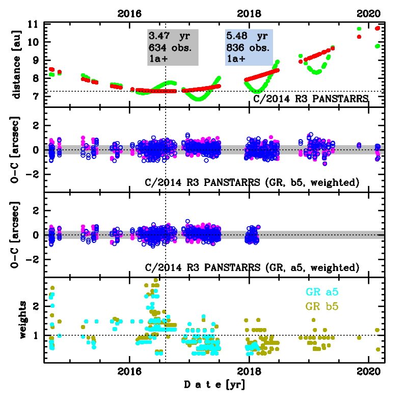 Upper panel: Time distribution of positional observations with corresponding heliocentric (red curve) and geocentric (green curve) distance at which they were taken. The horizontal dotted line shows the perihelion distance for a given comet whereas vertical dotted line — the moment of perihelion passage.