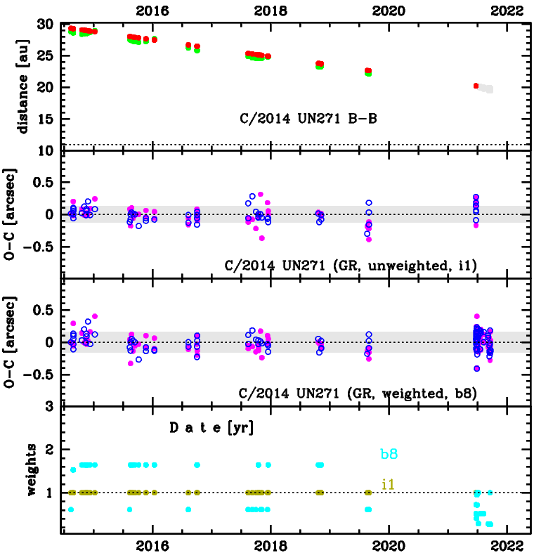 GR solution 'b8' perfectly fits the data; however, GR solution 'd5' based on longer data arc shows that something happened at the end of 2021 because some trend are visible in the period 2010-2020. For example, there may have been some more violent activity associated with the breakaway of a comet fragment as early as late 2021 (heliocentric distance of about 20 au; see [O-C] for the 'ba' solution). These trends in [O-C] indicates that the outburst reported by Kokotanekova et al (2024) was associated with a noticeable action of NG acceleration forces on the comet's motion. This is all the more interesting because it is a very large comet, with a size estimated at 60 km thanks to ALMA and HST observations.