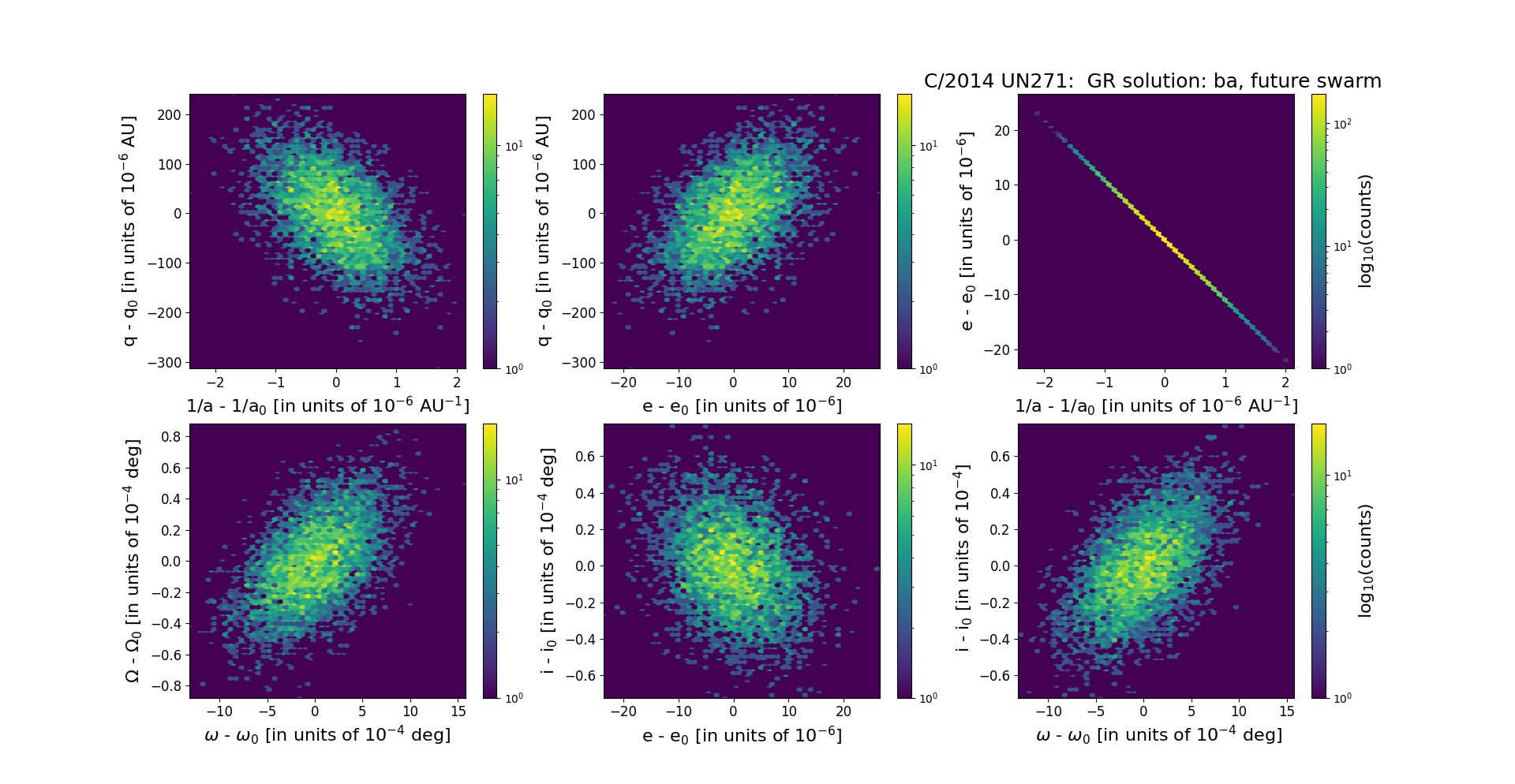 GR solution 'b8' perfectly fits the data; however, GR solution 'd5' based on longer data arc shows that something happened at the end of 2021 because some trend are visible in the period 2010-2020. For example, there may have been some more violent activity associated with the breakaway of a comet fragment as early as late 2021 (heliocentric distance of about 20 au; see [O-C] for the 'ba' solution). These trends in [O-C] indicates that the outburst reported by Kokotanekova et al (2024) was associated with a noticeable action of NG acceleration forces on the comet's motion. This is all the more interesting because it is a very large comet, with a size estimated at 60 km thanks to ALMA and HST observations.