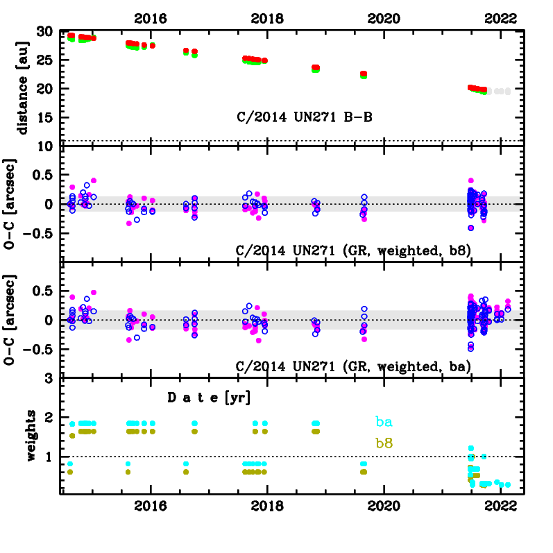 GR solution 'b8' perfectly fits the data; however, GR solution 'd5' based on longer data arc shows that something happened at the end of 2021 because some trend are visible in the period 2010-2020. For example, there may have been some more violent activity associated with the breakaway of a comet fragment as early as late 2021 (heliocentric distance of about 20 au; see [O-C] for the 'ba' solution). These trends in [O-C] indicates that the outburst reported by Kokotanekova et al (2024) was associated with a noticeable action of NG acceleration forces on the comet's motion. This is all the more interesting because it is a very large comet, with a size estimated at 60 km thanks to ALMA and HST observations.