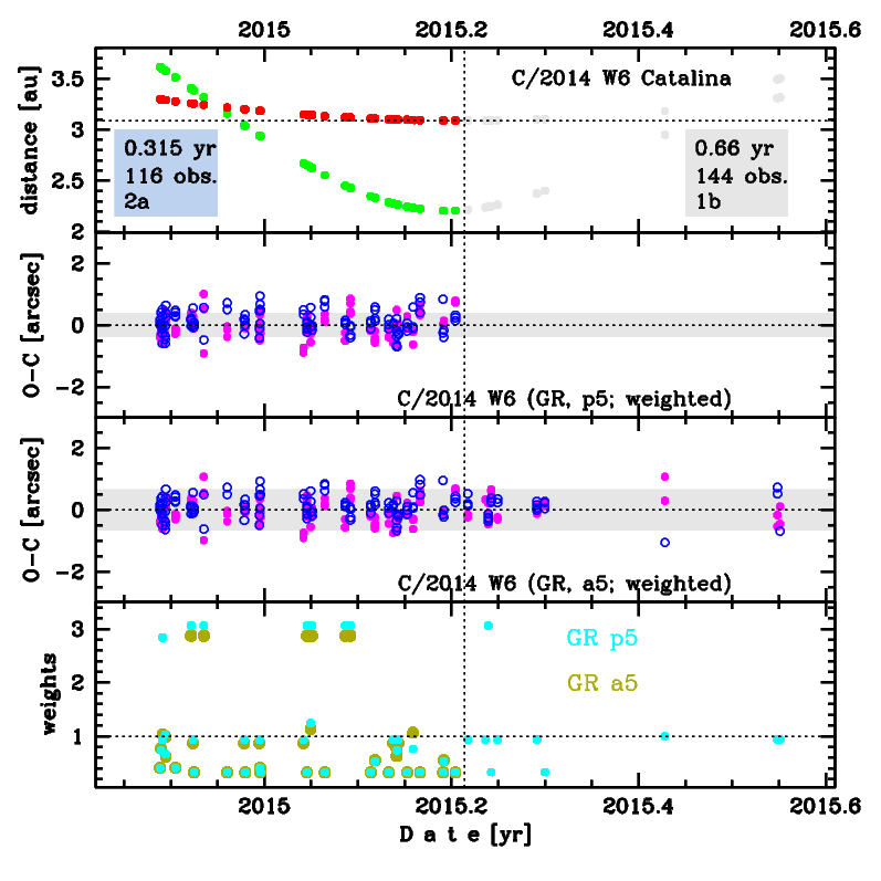 Despite the large perihelion distance (3.01 au), this is a comet with NG effects determinable by positional data fitting (solution 'c5'). However, this NG solution gives marginally hyperbolic original orbit with large uncertainty. Therefore, because of the similarity of the original semimajor axis obtained from GR solutions 'a5' (entire data arc) and 'p5' (pre-perihelion data arc), and the narrow range of heliocentric distances for NG orbit determination, the solution 'a5' is proposed here as the preferred orbit. Solutions 'a5' (GR, preferred) and 'c5' (NG, sublimation of more volatile icesd than water ice) are based on data spanning over 0.66 yr in a range of heliocentric distances: 3.30 au – 3.01 au (perihelion) – 3.31 au.