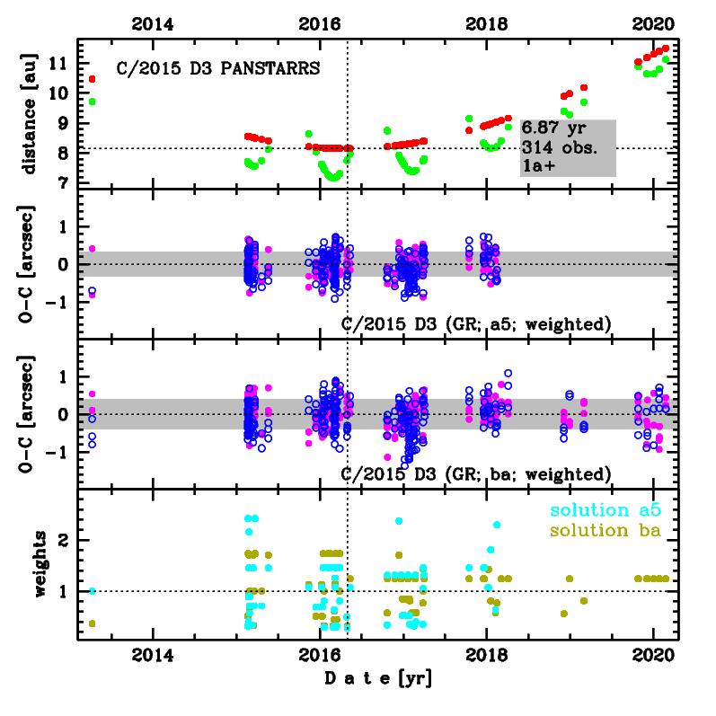 Solutions given here are based on data spanning over 6.87 yr in a range of heliocentric distances: 10.46 au – 8.149 au (perihelion) – 11.49 au.