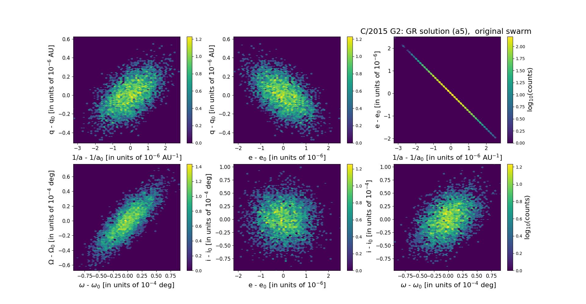 This is a comet with NG effects strongly manifested in positional data fitting. Solutions 'a5' and 'n5' (preferred) are based on data spanning over 0.86 yr in a range of heliocentric distances: 1.28 au – 0.780 au (perihelion) – 3.85 au. Though many trends visible in [O-C] for the GR solution are eliminated thanks to the NG solution, large residuals in alpha in the data from the beginning of the arc performed by MASTER (arc data: March 30 – April 8) are still worrying, which resulted in ejecting these positions in alpha (and leaving them in delta; see the [O-C] picture for solutions 'a5' and 'n5').