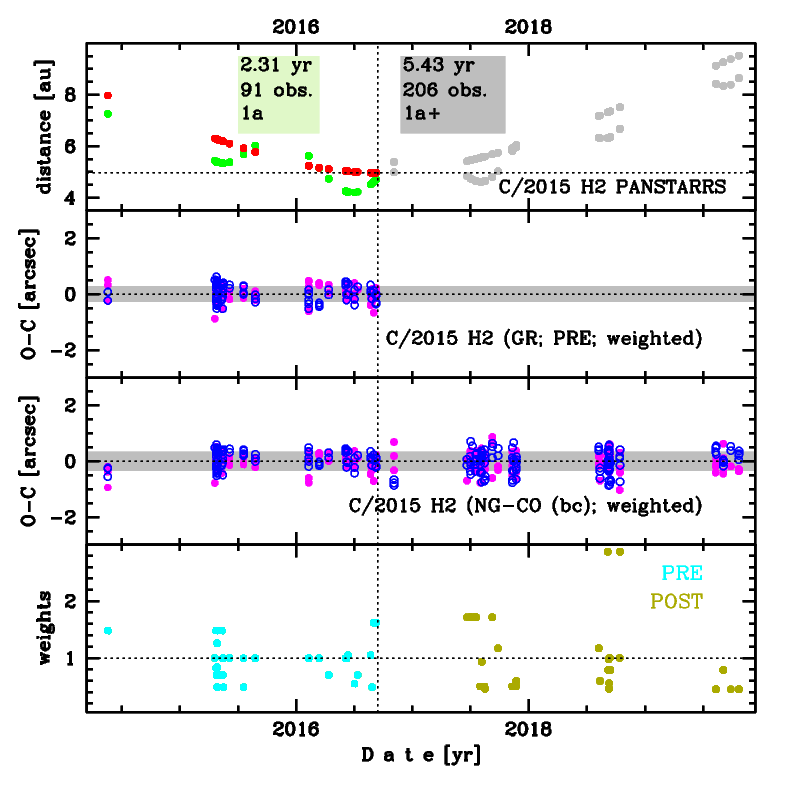 | detectability of NG effects in the comet's motion | comet with NG effects strongly manifested in positional data fitting | |