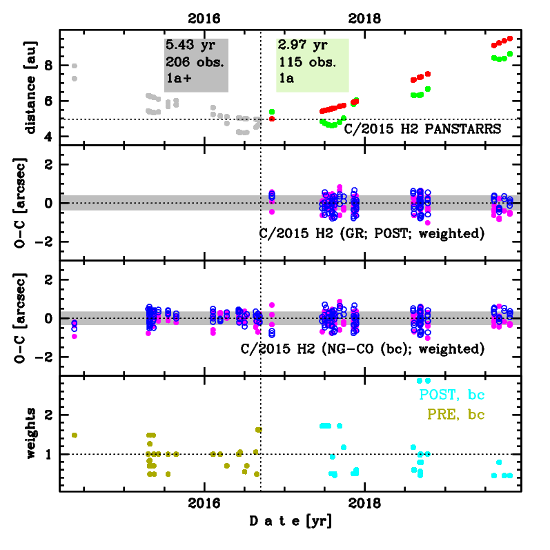 | detectability of NG effects in the comet's motion | comet with NG effects strongly manifested in positional data fitting | |