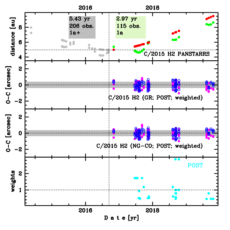 Upper panel: Time distribution of positional observations with corresponding heliocentric (red curve) and geocentric (green curve) distance at which they were taken. The horizontal dotted line shows the perihelion distance for a given comet whereas vertical dotted line — the moment of perihelion passage.