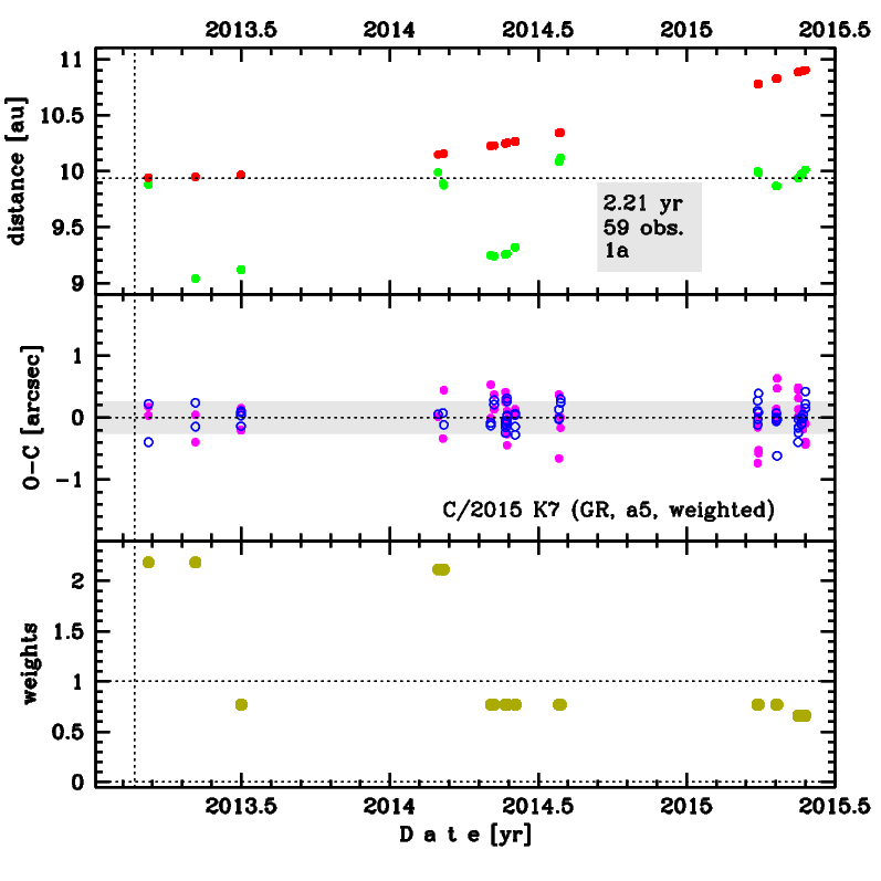 Thus, the GR solution given here is based on post-perihelion data span over 2.21 yr in a range of heliocentric distances from 9.94 au to 10.90 au.
