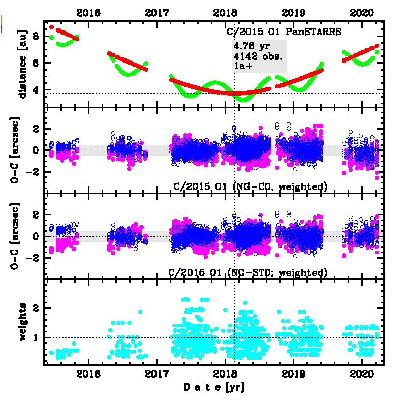 Comet C/2015 O1 was discovered on 19 July 2015 with Pan-STARRS 1 telescope (Haleakala), that is about months after its perihelion passage.