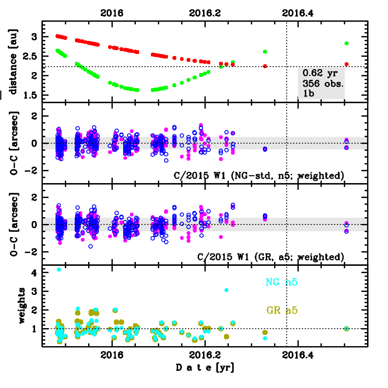 This is a comet with NG effects determinable using positional data fitting. Both solutions (GR and NG) are based on data spanning over 0.625 yr in a range of heliocentric distances: 3.01 au – 2.232 au (perihelion) – 2.30 au.