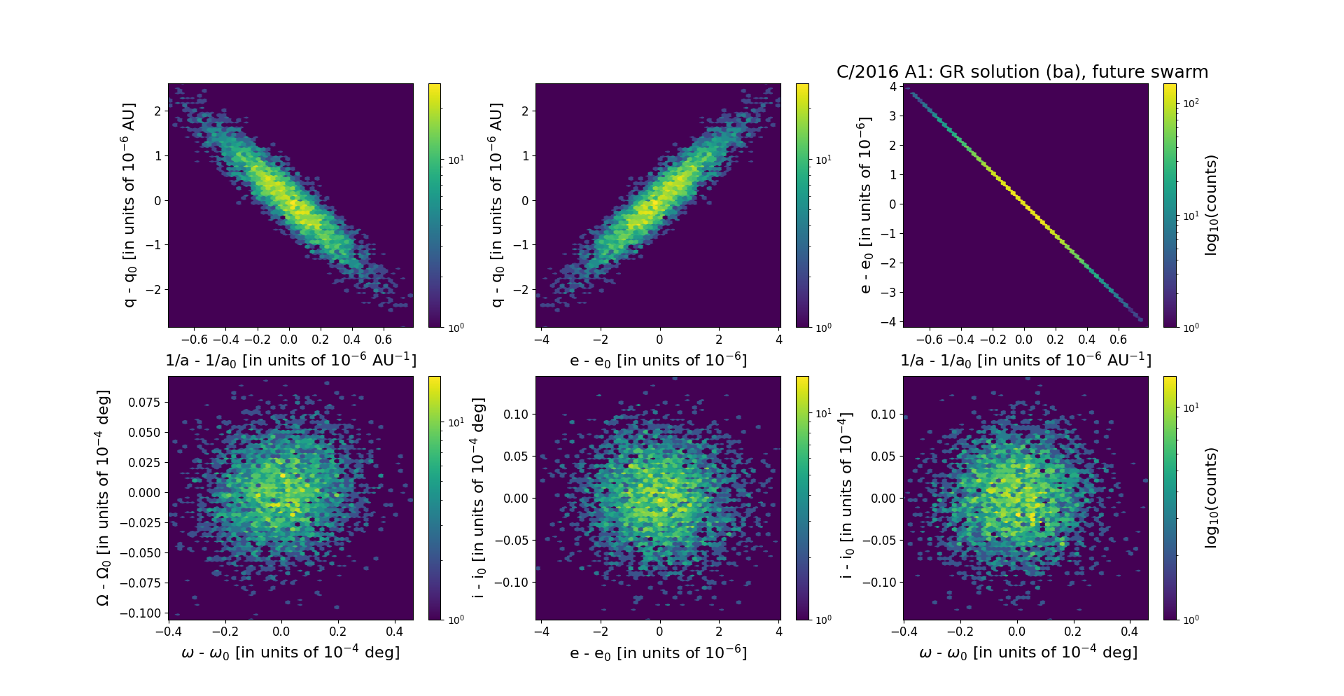 This Oort spike comet suffers small planetary perturbations during its passage through the planetary system that lead to a more tight future orbit (see future barycentric orbit).